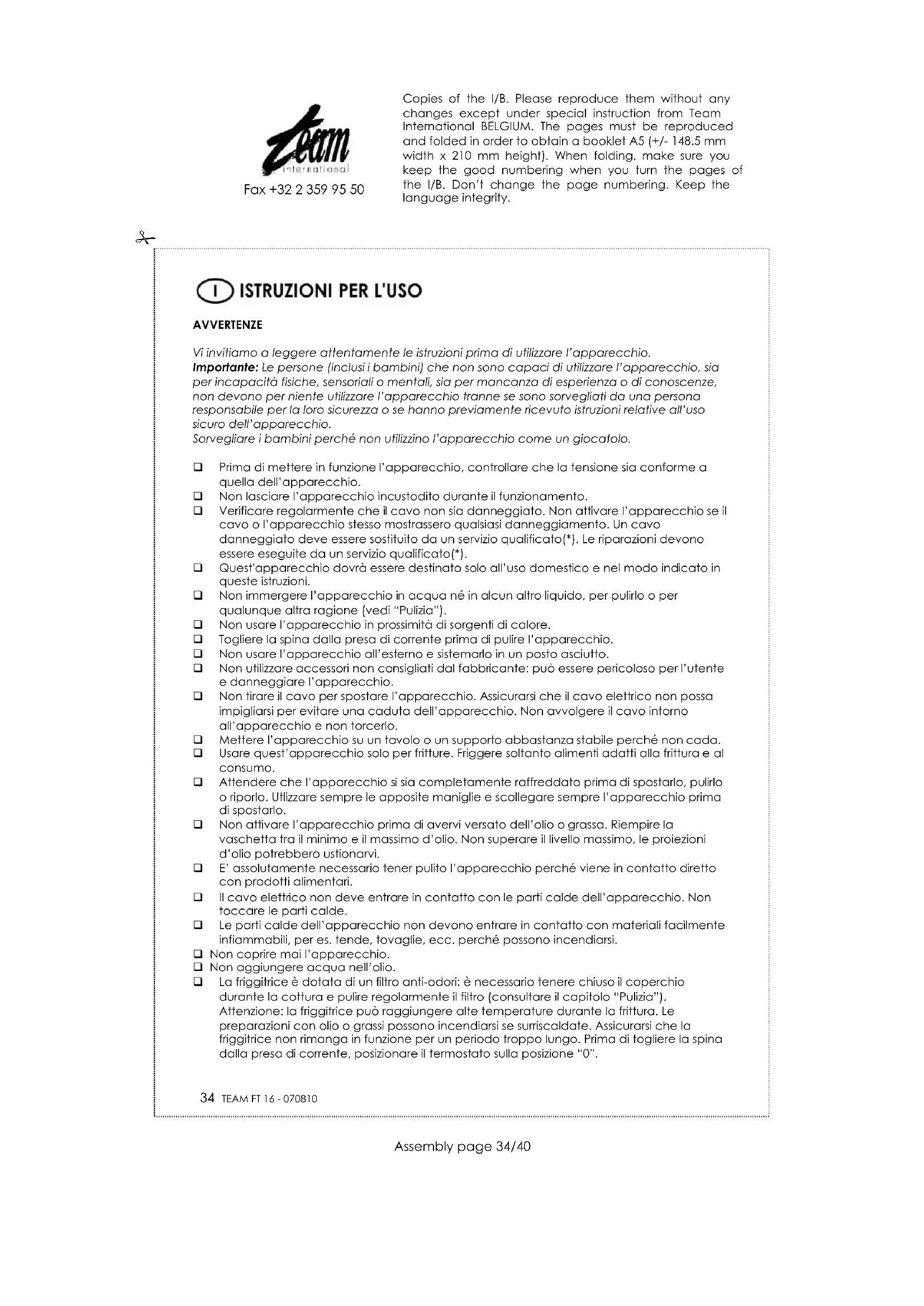 Fax +32 2 359 95 50 PULIZIA NON IMMERGERE L’APPARECCHIO IN ACQUA, NÉ IN ALCUN ALTRO LIQUIDO. Staccare la spina dalla presa di corrente. Attendere che l‟apparecchio si sia completamente raffreddato. Seguire le istruzioni “Smontaggio”. Non usare detergenti troppo forti o materiali abrasivi per non rovinare l‟apparecchio. Attenzione: se estraete la vaschetta, assicuratevi che non ci siano olio, acqua né altri liquidi che penetrino all‟interno dell‟apparecchio. Pulite l‟interno dell‟apparecchio con uno straccio asciutto. Asciugare accuratamente tutte le parti dell‟apparecchio. Cambiare l‟olio regolarmente. Cambiare regolarmente il filtro antiodore. Per sostituirlo, aprire la griglia posta sul coperchio. Pulire regolarmente l‟apparecchio per prolungarne la durata. Per montare l‟apparecchio, seguire le istruzioni del capitolo relativo. SISTEMAZIONE Attendere che l‟apparecchio si sia completamente raffreddato prima di riporlo. Il prodotto può essere riposto con l‟olio al suo interno, ma assicurandosi che il coperchio sia perfettamente chiuso, affinchè la polvere non possa penetrare all‟interno. DIRETTIVA 2002/96/CE SULLO SMALTIMENTO DI APPARECCHI ELETTRICI ED ELETTRONICI Per preservare l'ambiente e la nostra salute, l'eliminazione dei vecchi apparecchi elettrici ed elettronici non più utilizzati, va fatta secondo la direttiva sopra citata che impone l'obbligo al costruttore, al commerciante e all‟utilizzatore di consegnare gli apparecchi ai centri di raccolta specializzati, i quali saranno in grado di smaltire e riciclare i vecchi prodotti come la legge prescrive. Per questa ragione troverete apposto sull‟etichetta segnaletica il simbolo che indica di non gettare il vecchio apparecchio non più utilizzato, in pattumiera o nel cassonetto delle immondizie. Per eliminare il vecchio apparecchio non più utilizzato, potete consegnarlo al rivenditore il cambio di quello nuovo acquistato, o direttamente nei centri di raccolta specializzati messi a disposizione dal vostro comune di residenza. Copies of the I/B. Please reproduce them without any changes except under special instruction from Team International BELGIUM. The pages must be reproduced and folded in order to obtain a booklet A5 (+/- 148.5 mm width x 210 mm height). When folding, make sure you keep the good numbering when you turn the pages of the I/B. Don‟t change the page numbering. Keep the language integrity.