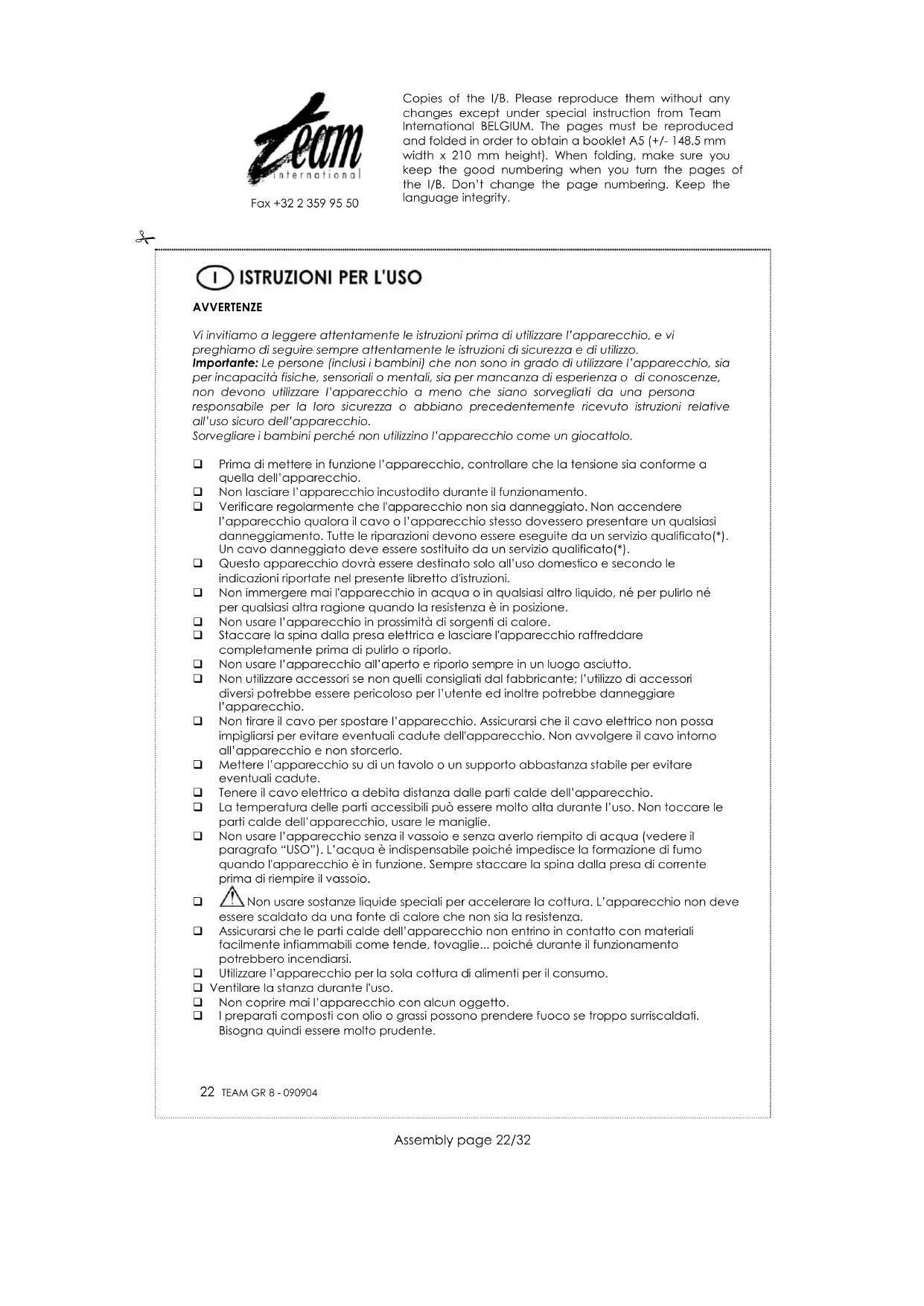 Prima di pulire l'apparecchio, spegnerlo, disinserire la spina dalla presa di corrente e lasciarlo raffreddare. Togliere la griglia e il vassoio e eliminare l‟acqua residua. Per la pulizia dell‟elemento riscaldante utilizzare un panno morbido leggermente umido; dopo la pulizia asciugarne accuratamente tutte le parti. Non immergere né la resistenza, né il pannello comandi in acqua o in altro liquido; non inserirlo in lavastoviglie. Per la pulizia del vassoio e della griglia utilizzare acqua calda e detergente per stoviglie; verificare che siano asciutti prima di riutilizzarli. ATTENZIONE: NON IMMERGERE LA RESISTENZA NE‟ IL PANNELLO COMANDI. Non utilizzare prodotti abrasivi o corrosivi. DIRETTIVA 2002/96/CE PER LO SMALTIMENTO DELLE APPARECCHIATURE ELETTRICHE ED ELETTRONICHE Per preservare l'ambiente e la nostra salute, i vecchi apparecchi elettrici e elettronici non più utilizzati devono essere smaltiti secondo la direttiva sopra citata che impone l'obbligo al costruttore, al commerciante e all'utilizzatore di consegnare gli apparecchi ai centri di raccolta specializzati, i quali saranno in grado di smaltire e riciclare i vecchi prodotti come la legge prescrive. Per questa ragione troverete apposto sulla targhetta identificativa o sull'imballaggio il simbolo che indica di non gettare il vecchio apparecchio in pattumiera o nel cassonetto delle immondizie. Per eliminare il vecchio apparecchio non più utilizzato, potete consegnarlo al rivenditore il cambio di quello nuovo acquistato, o direttamente nei centri di raccolta specializzati messi a disposizione dal vostro comune di residenza. Copies of the I/B. Please reproduce them without any changes except under special instruction from Team International BELGIUM. The pages must be reproduced and folded in order to obtain a booklet A5 (+/- 148.5 mm width x 210 mm height). When folding, make sure you keep the good numbering when you turn the pages of the I/B. Don‟t change the page numbering. Keep the language integrity.