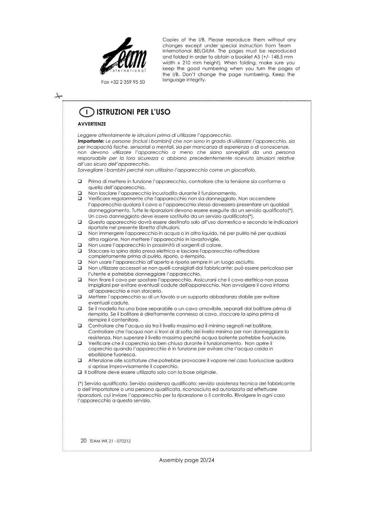 Fax +32 2 359 95 50 DIRETTIVA 2002/96/CE PER LO SMALTIMENTO DELLE APPARECCHIATURE ELETTRICHE ED ELETTRONICHE Per preservare l'ambiente e la nostra salute, i vecchi apparecchi elettrici e elettronici non più utilizzati devono essere smaltiti secondo la direttiva sopra citata che impone l'obbligo al costruttore, al commerciante e all'utilizzatore di consegnare gli apparecchi ai centri di raccolta specializzati, i quali saranno in grado di smaltire e riciclare i vecchi prodotti come la legge prescrive. Per questa ragione troverete apposto sulla targhetta identificativa o sull'imballaggio il simbolo che indica di non gettare il vecchio apparecchio in pattumiera o nel cassonetto delle immondizie. Per eliminare il vecchio apparecchio non più utilizzato, potete consegnarlo al rivenditore il cambio di quello nuovo acquistato, o direttamente nei centri di raccolta specializzati messi a disposizione dal vostro comune di residenza. Copies of the I/B. Please reproduce them without any changes except under special instruction from Team International BELGIUM. The pages must be reproduced and folded in order to obtain a booklet A5 (+/- 148.5 mm width x 210 mm height). When folding, make sure you keep the good numbering when you turn the pages of the I/B. Don’t change the page numbering. Keep the language integrity.