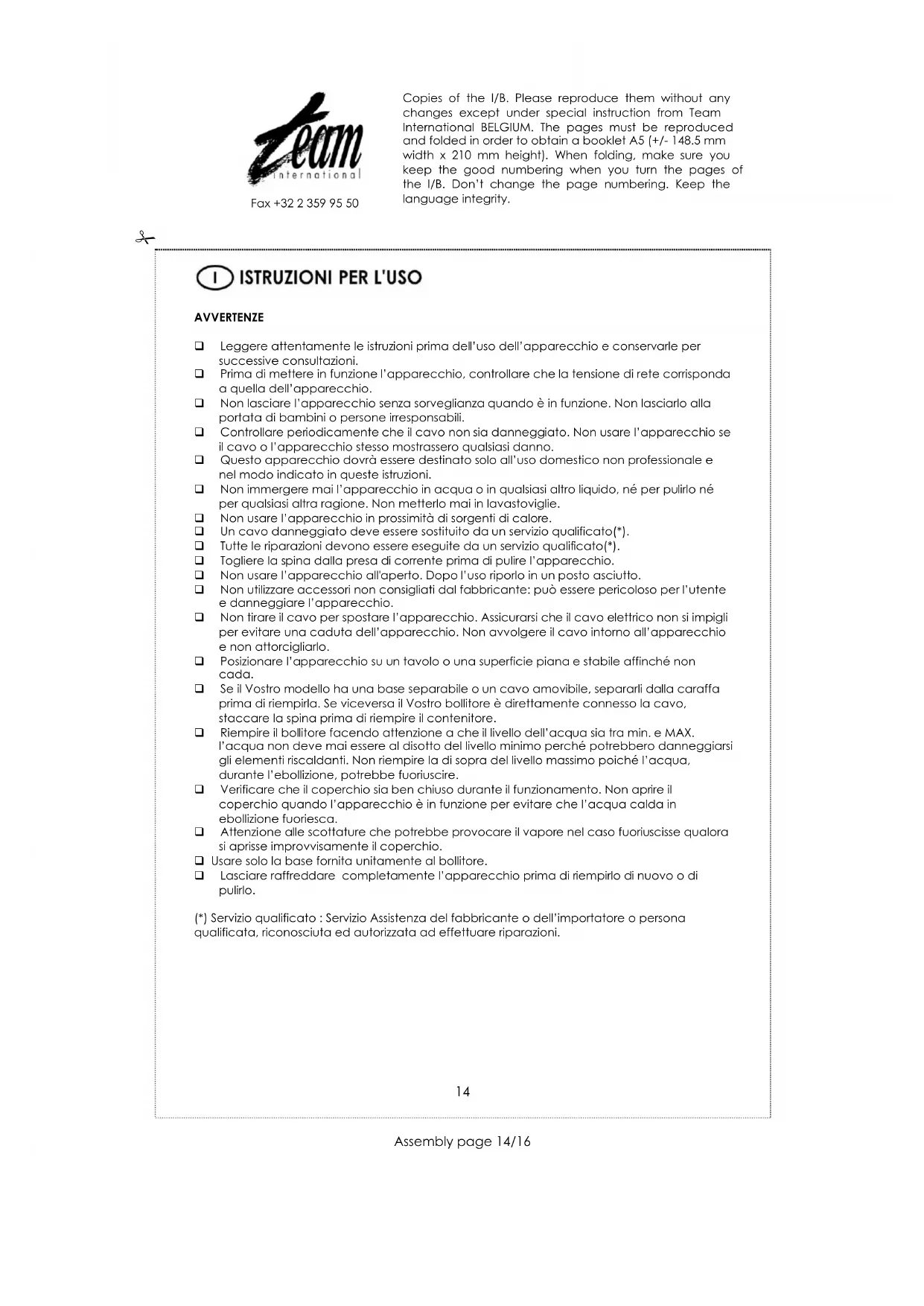 (*) Servizio qualificato : Servizio Assistenza del fabbricante o dell'importatore o persona qualificata, riconosciuta ed autorizzato ad effettuare riparazioni.