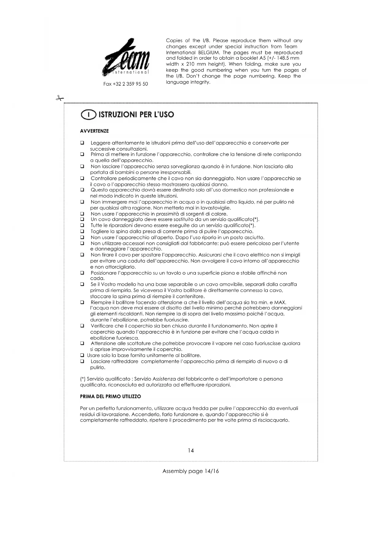 Fax +32 2 359 95 50 FUNZIONAMENTO Verificare che l’apparecchio sia spento (controllare l’interruttore). Staccare sempre la caraffa dalla base prima di riempirla o prima di qualsiasi altra operazione. Aprire il coperchio e riempire la caraffa facendo attenzione a non andare oltre il livello massimo o al disotto del livello minimo. E’ possibile verificare il livello dell’acqua attraverso l’indicatore trasparente posto sulla caraffa. Chiudere bene il coperchio, posizionare la caraffa sopra la base, inserire la spina nella presa di corrente e accendere l’apparecchio. Quando l'acqua bolle l’apparecchio si spegne automaticamente. Si può comunque spegnerlo in qualsiasi momento agendo sull'interruttore. Se si desidera scaldare l'acqua due volte di seguito, attendere che l’acqua si sia sufficientemente raffreddata al fine di poter riaccendere l’apparecchio, in quanto non sarà possibile farlo immediatamente. Terminato l'utilizzo, spegnere l’apparecchio agendo sull’interruttore apposito e disinserire la spina dalla presa di corrente.