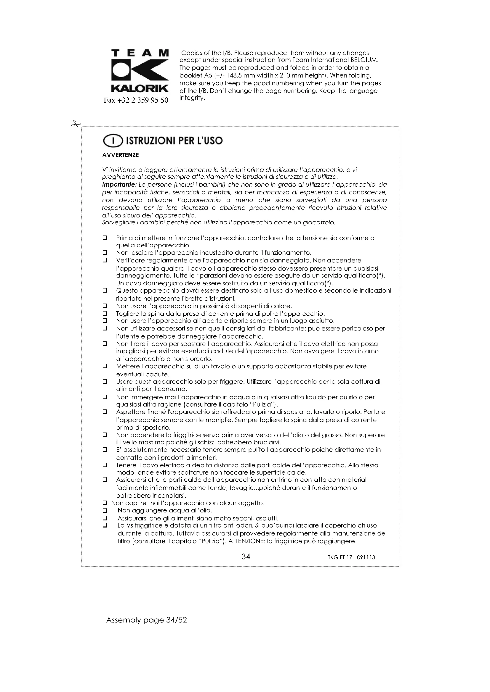 AVVERTENZE Vi invitiamo a leggere attentamente le istruzioni prima di utilizzare l’apparecchio, e vi preghiamo di seguire sempre attentamente le istruzioni di sicurezza e di utilizzo. Importante: Le persone (inclusi i bambini) che non sono in grado di utilizzare l’apparecchio, sia per incapacità fisiche, sensoriali o mentali, sia per mancanza di esperienza o di conoscenze, non devono utilizzare l’apparecchio a meno che siano sorvegliati da una persona responsabile per la loro sicurezza o abbiano precedentemente ricevuto istruzioni relative all’uso sicuro dell’apparecchio. Sorvegliare i bambini perché non utilizzino l’apparecchio come un giocattolo. Prima di mettere in funzione l’apparecchio, controllare che la tensione sia conforme a quella dell’apparecchio. Non lasciare l’apparecchio incustodito durante il funzionamento. Verificare regolarmente che l'apparecchio non sia danneggiato. Non accendere l’apparecchio qualora il cavo o l’apparecchio stesso dovessero presentare un qualsiasi danneggiamento. Tutte le riparazioni devono essere eseguite da un servizio qualificato(*). Un cavo danneggiato deve essere sostituito da un servizio qualificato(*). Questo apparecchio dovrà essere destinato solo all’uso domestico e secondo le indicazioni riportate nel presente libretto d'istruzioni. Non usare l’apparecchio in prossimità di sorgenti di calore. Togliere la spina dalla presa di corrente prima di pulire l’apparecchio. Non usare l’apparecchio all’aperto e riporlo sempre in un luogo asciutto. Non utilizzare accessori se non quelli consigliati dal fabbricante: può essere pericoloso per l’utente e potrebbe danneggiare l’apparecchio. Non tirare il cavo per spostare l’apparecchio. Assicurarsi che il cavo elettrico non possa impigliarsi per evitare eventuali cadute dell'apparecchio. Non avvolgere il cavo intorno all’apparecchio e non storcerlo. Mettere l’apparecchio su di un tavolo o un supporto abbastanza stabile per evitare eventuali cadute. Usare quest’apparecchio solo per friggere. Utilizzare l’apparecchio per la sola cottura di alimenti per il consumo. Non immergere mai l’apparecchio in acqua o in qualsiasi altro liquido per pulirlo o per qualsiasi altra ragione (consultare il capitolo “Pulizia”). Aspettare finché l'apparecchio sia raffreddato prima di spostarlo, lavarlo o riporlo. Portare l’apparecchio sempre con le maniglie. Sempre togliere la spina dalla presa di corrente prima di spostarlo. Non accendere la friggitrice senza prima aver versato dell’olio o del grasso. Non superare il livello massimo poiché gli schizzi potrebbero bruciarvi. E’ assolutamente necessario tenere sempre pulito l’apparecchio poiché direttamente in contatto con i prodotti alimentari. Tenere il cavo elettrico a debita distanza dalle parti calde dell’apparecchio. Allo stesso modo, onde evitare scottature non toccare le superficie calde. Assicurarsi che le parti calde dell’apparecchio non entrino in contatto con materiali facilmente infiammabili come tende, tovaglie...poiché durante il funzionamento potrebbero incendiarsi. Non coprire mai l’apparecchio con alcun oggetto.