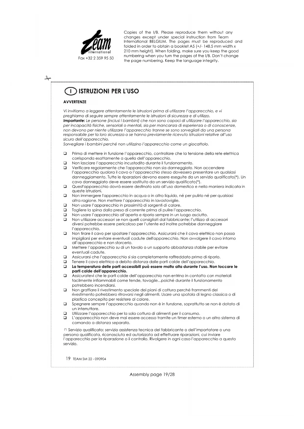 Fax +32 2 359 95 50 DIRETTIVA 2002/96/CE PER LO SMALTIMENTO DELLE APPARECCHIATURE ELETTRICHE ED ELETTRONICHE Per preservare l'ambiente e la nostra salute, l'eliminazione dei vecchi apparecchi elettrici ed elettronici non più utilizzati, va fatta secondo la direttiva sopra citata che impone l'obbligo al costruttore, al commerciante ed all'utilizzatore di consegnare gli apparecchi ai centri di raccolta specializzati, i quali saranno in grado di smaltire e riciclare i vecchi prodotti come la legge prescrive. Per questa ragione troverete apposto sull’etichetta segnaletica il simbolo che indica di non gettare il vecchio apparecchio non più utilizzato, in pattumiera o nel cassonetto delle immondizie. Potrete smaltire il vecchio apparecchio consegnandolo direttamente al rivenditore dove andrete ad acquistarne uno nuovo, o direttamente nei centri di raccolta specializzati messi a disposizione dal vostro comune di residenza. Copies of the I/B. Please reproduce them without any changes except under special instruction from Team International BELGIUM. The pages must be reproduced and folded in order to obtain a booklet A5 (+/- 148.5 mm width x 210 mm height). When folding, make sure you keep the good numbering when you turn the pages of the I/B. Don’t change the page numbering. Keep the language integrity.