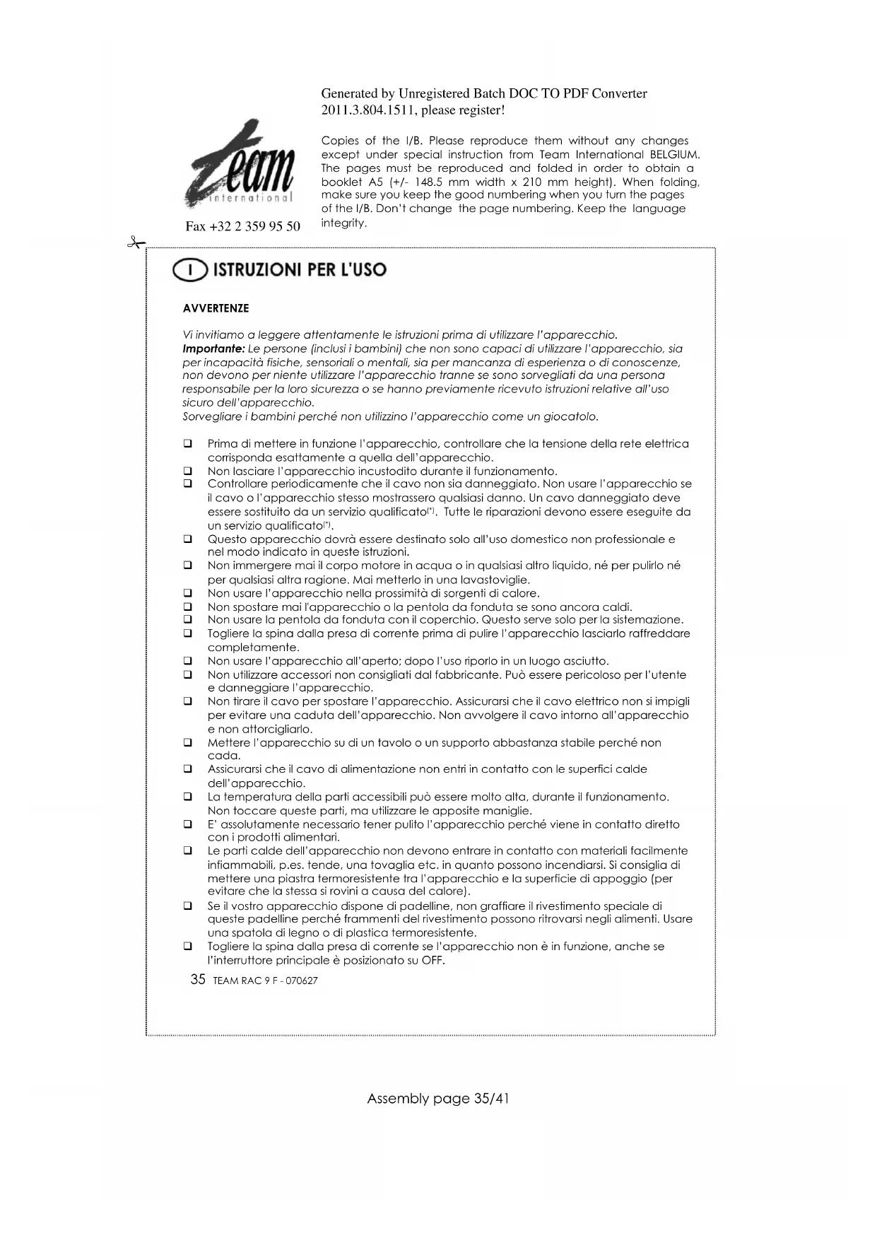 Questo apparecchio dovrà essere destinato solo all’uso domestico non professionale e nel modo indicato in queste istruzioni. Non immergere mai il corpo motore in acqua o in qualsiasi altro liquido, né per pulirlo né per qualsiasi altra ragione. Mai metterlo in una lavastoviglie. Non usare l’apparecchio nella prossimità di sorgenti di calore. Non spostare mai l'apparecchio o la pentola da fonduta se sono ancora caldi. Non usare la pentola da fonduta con il coperchio. Questo serve solo per la sistemazione. Togliere la spina dalla presa di corrente prima di pulire l’apparecchio lasciarlo raffreddare completamente. Non usare l’apparecchio all’aperto; dopo l’uso riporlo in un luogo asciutto. Non utilizzare accessori non consigliati dal fabbricante. Può essere pericoloso per l’utente e danneggiare l’apparecchio. Non tirare il cavo per spostare l’apparecchio. Assicurarsi che il cavo elettrico non si impigli per evitare una caduta dell’apparecchio. Non avvolgere il cavo intorno all’apparecchio e non attorcigliarlo. Mettere l’apparecchio su di un tavolo o un supporto abbastanza stabile perché non cada. Assicurarsi che il cavo di alimentazione non entri in contatto con le superfici calde dell’apparecchio. La temperatura della parti accessibili può essere molto alta, durante il funzionamento. Non toccare queste parti, ma utilizzare le apposite maniglie. E’ assolutamente necessario tener pulito l’apparecchio perché viene in contatto diretto con i prodotti alimentari. Le parti calde dell’apparecchio non devono entrare in contatto con materiali facilmente infiammabili, p.es. tende, una tovaglia etc. in quanto possono incendiarsi. Si consiglia di mettere una piastra termoresistente tra l’apparecchio e la superficie di appoggio (per evitare che la stessa si rovini a causa del calore). Se il vostro apparecchio dispone di padelline, non graffiare il rivestimento speciale di queste padelline perché frammenti del rivestimento possono ritrovarsi negli alimenti. Usare una spatola di legno o di plastica termoresistente. Togliere la spina dalla presa di corrente se l’apparecchio non è in funzione, anche se l’interruttore principale è posizionato su OFF.Generated by Unregistered Batch DOC TO PDF Converter 2011.3.804.1511, please register! Copies of the I/B. Please reproduce them without any changes except under special instruction from Team International BELGIUM. The pages must be reproduced and folded in order to obtain a booklet A5 (+/- 148.5 mm width x 210 mm height). When folding, make sure you keep the good numbering when you turn the pages of the I/B. Don’t change the page numbering. Keep the language integrity.