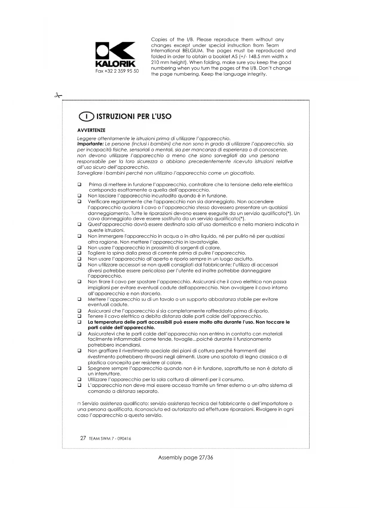 Fax +32 2 359 95 50 DIRETTIVA 2002/96/CE PER LO SMALTIMENTO DELLE APPARECCHIATURE ELETTRICHE ED ELETTRONICHE Per preservare l'ambiente e la nostra salute, i vecchi apparecchi elettrici e elettronici non più utilizzati devono essere smaltiti secondo la direttiva sopra citata che impone l'obbligo al costruttore, al commerciante e all'utilizzatore di consegnare gli apparecchi ai centri di raccolta specializzati, i quali saranno in grado di smaltire e riciclare i vecchi prodotti come la legge prescrive. Per questa ragione troverete apposto sulla targhetta identificativa o sull'imballaggio il simbolo che indica di non gettare il vecchio apparecchio in pattumiera o nel cassonetto delle immondizie. Per eliminare il vecchio apparecchio non più utilizzato, potete consegnarlo al rivenditore il cambio di quello nuovo acquistato, o direttamente nei centri di raccolta specializzati messi a disposizione dal vostro comune di residenza. Copies of the I/B. Please reproduce them without any changes except under special instruction from Team International BELGIUM. The pages must be reproduced and folded in order to obtain a booklet A5 (+/- 148.5 mm width x 210 mm height). When folding, make sure you keep the good numbering when you turn the pages of the I/B. Don’t change the page numbering. Keep the language integrity.