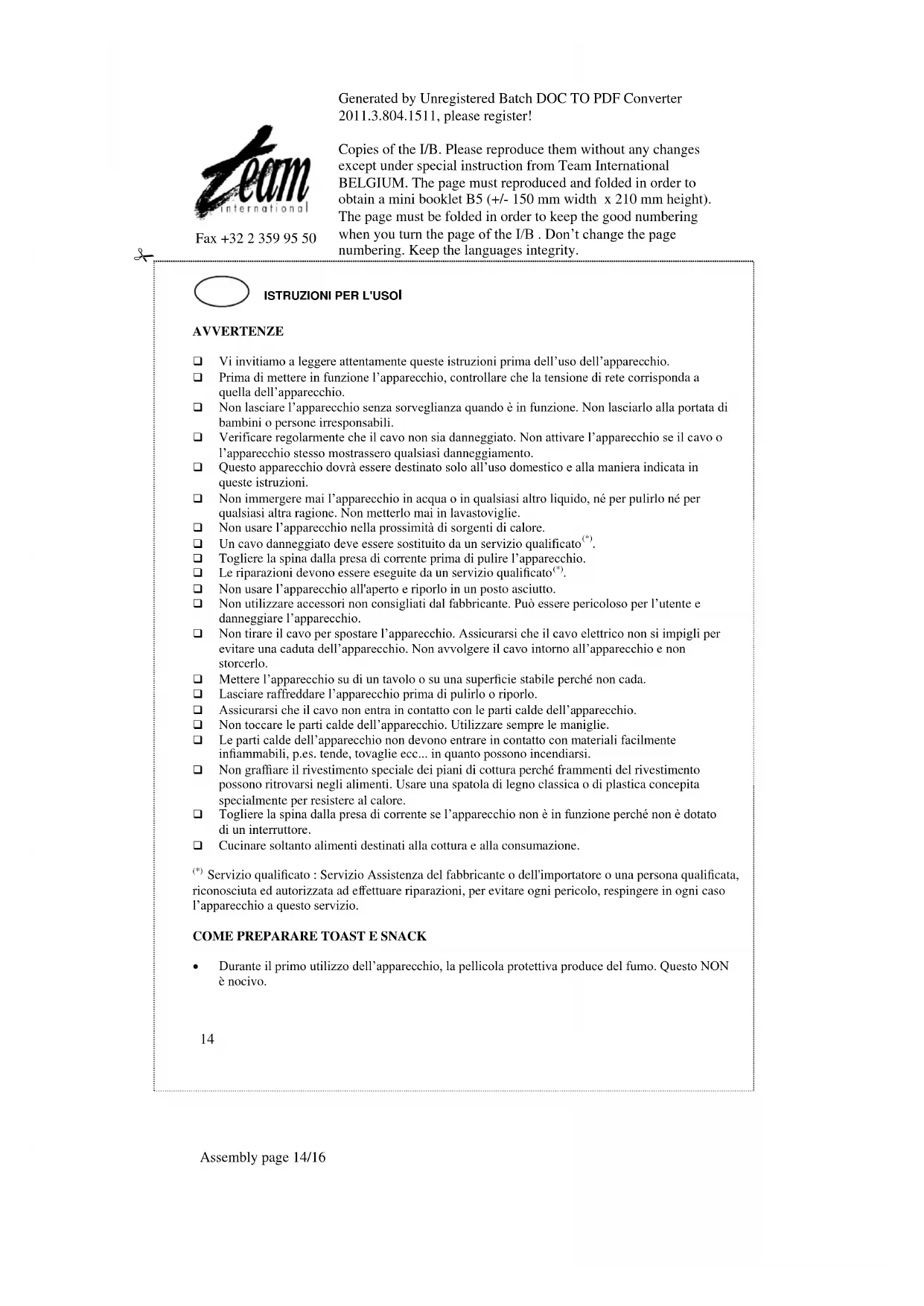 Preriscaldare sempre l’apparecchio prima dell’uso. Collegarlo durante la preparazione dei toast. Se la farcitura è liquida o grassa, utilizzare dei tranci di pane bianco o nero a fette. Può essere utilizzato del burro aromatico. Spalmare del lardo sui tranci di pane che arrostiscono per accentuare il gusto. Spargere dello zucchero all’esterno delle fette di pane per ottenere una preparazione più croccante. PULIZIA Prima di pulire l’apparecchio, scollegare la spina e lasciarlo raffreddare. Asciugare la parte interna e gli angoli dell’apparecchio con della carta assorbente o un panno morbido. Asciugare la parte esterna dell’apparecchio con un panno leggermente umido, assicurarsi che l’umidità, olio ed il grasso di cottura non si infiltrino negli sbocchi di raffreddamento dell’apparecchio. Non pulire l’apparecchio (sia la parte interna che esterna) con prodotti abrasivi per non rovinare il rivestimento. Non immergere l’apparecchio in acqua o in altri liquidi.Copies of the I/B. Please reproduce them without any changes except under special instruction from Team International BELGIUM. The page must reproduced and folded in order to obtain a mini booklet B5 (+/- 150 mm width x 210 mm height). The page must be folded in order to keep the good numbering when you turn the page of the I/B . Don’t change the page numbering. Keep the languages integrity.