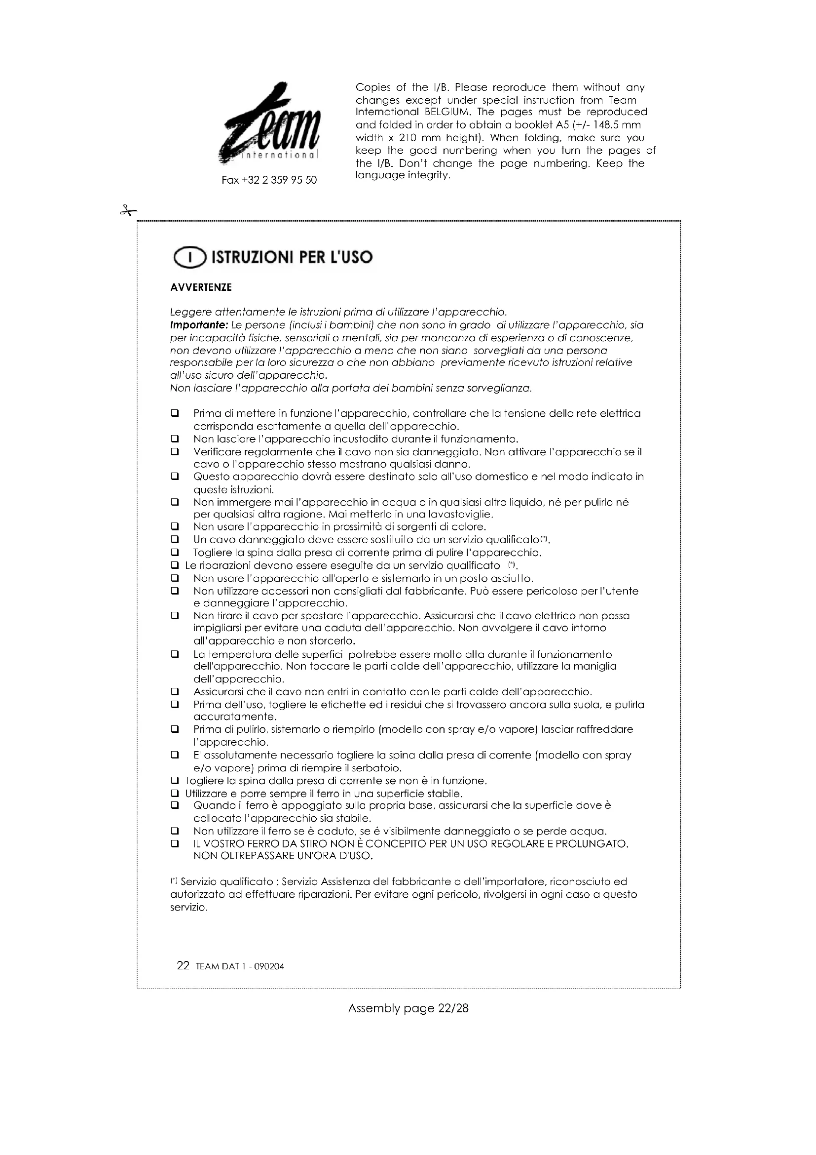 Scarica le istruzioni per il tuo Ferro da stiro in formato PDF gratuitamente! Trova il tuo manuale DAT 1 - TEAM e riprendi in mano il tuo dispositivo elettronico. In questa pagina sono pubblicati tutti i documenti necessari per l'utilizzo del tuo dispositivo. DAT 1 del marchio TEAM.