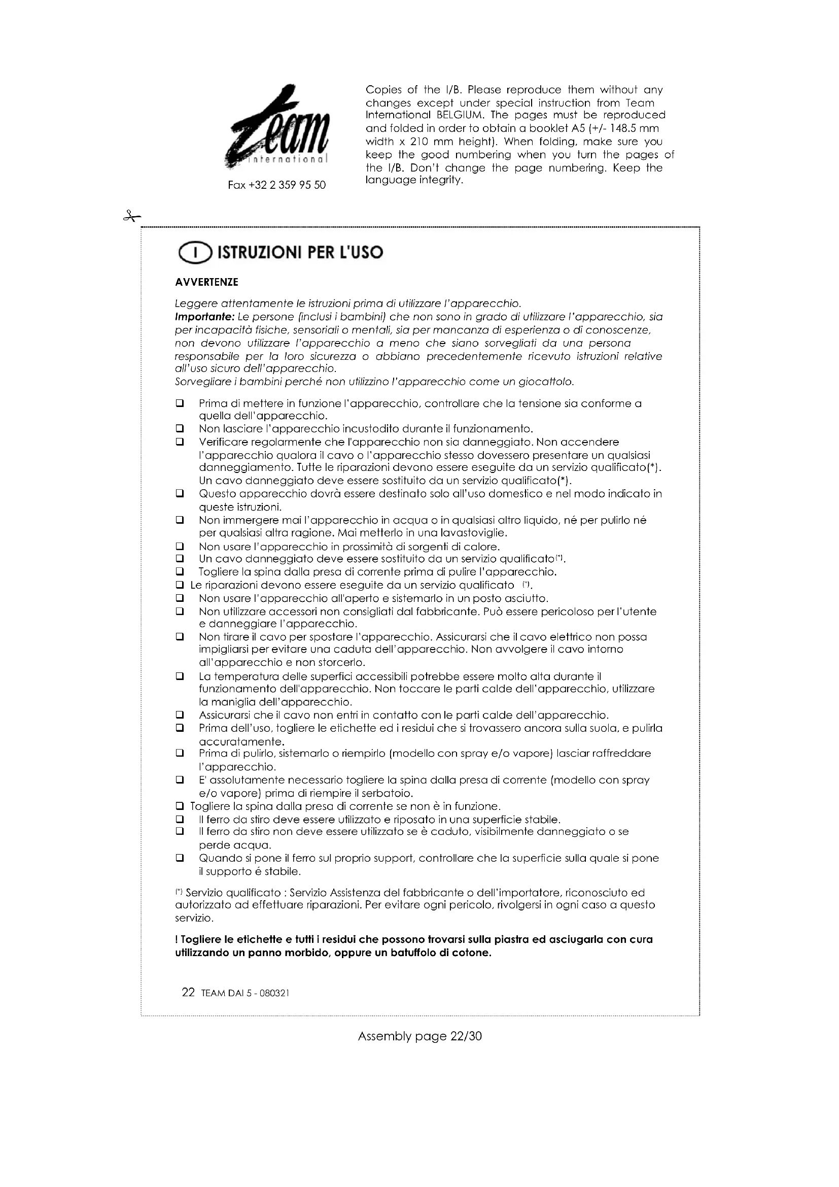 Scarica le istruzioni per il tuo Ferro da stiro in formato PDF gratuitamente! Trova il tuo manuale DAI 5 - TEAM e riprendi in mano il tuo dispositivo elettronico. In questa pagina sono pubblicati tutti i documenti necessari per l'utilizzo del tuo dispositivo. DAI 5 del marchio TEAM.