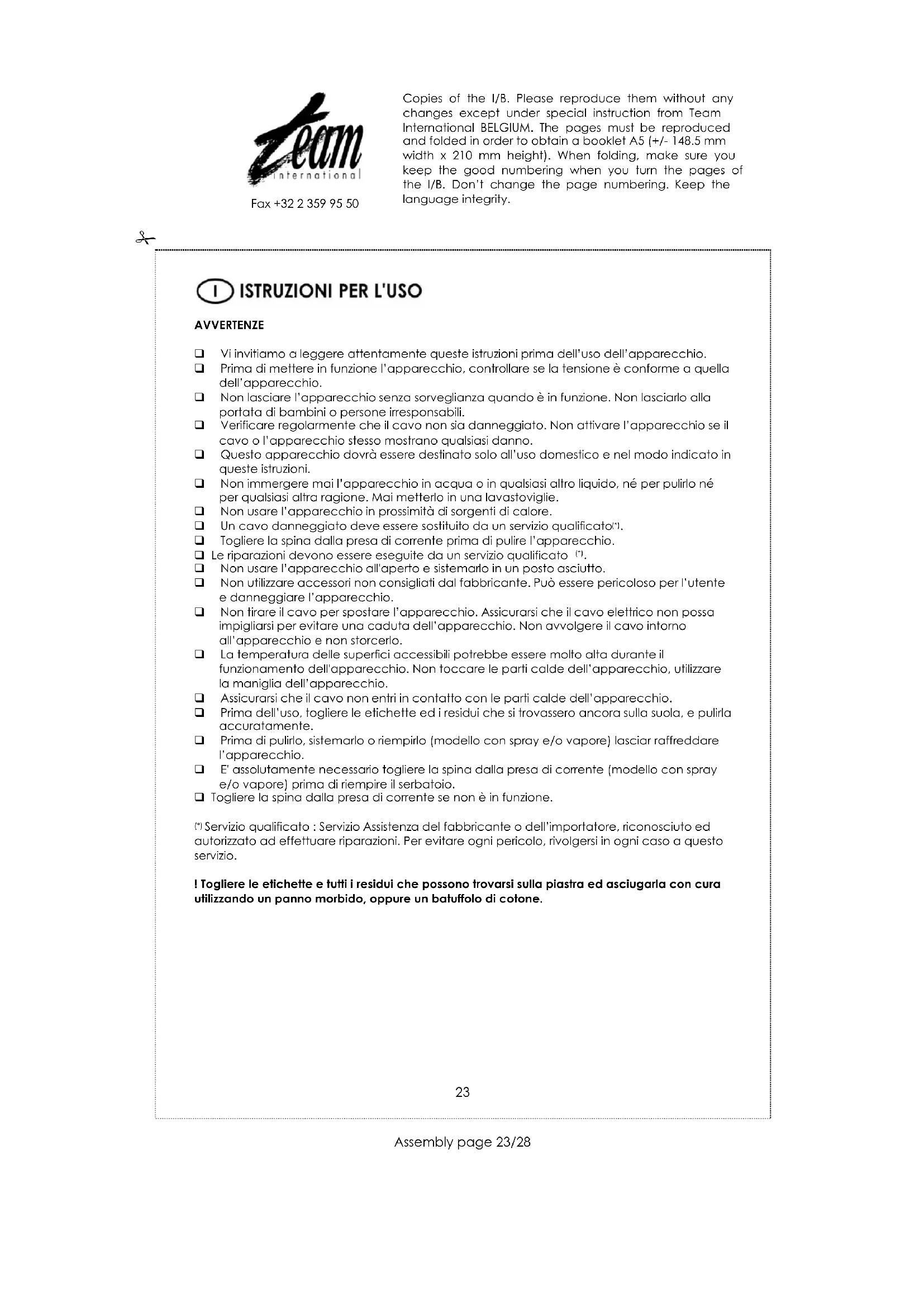 Servizio qualificato : Servizio Assistenza del fabbricante o dell‟importatore, riconosciuto ed autorizzato ad effettuare riparazioni. Per evitare ogni pericolo, rivolgersi in ogni caso a questo servizio. ! Togliere le etichette e tutti i residui che possono trovarsi sulla piastra ed asciugarla con cura utilizzando un panno morbido, oppure un batuffolo di cotone. Copies of the I/B. Please reproduce them without any changes except under special instruction from Team International BELGIUM. The pages must be reproduced and folded in order to obtain a booklet A5 (+/- 148.5 mm width x 210 mm height). When folding, make sure you keep the good numbering when you turn the pages of the I/B. Don‟t change the page numbering. Keep the language integrity.
