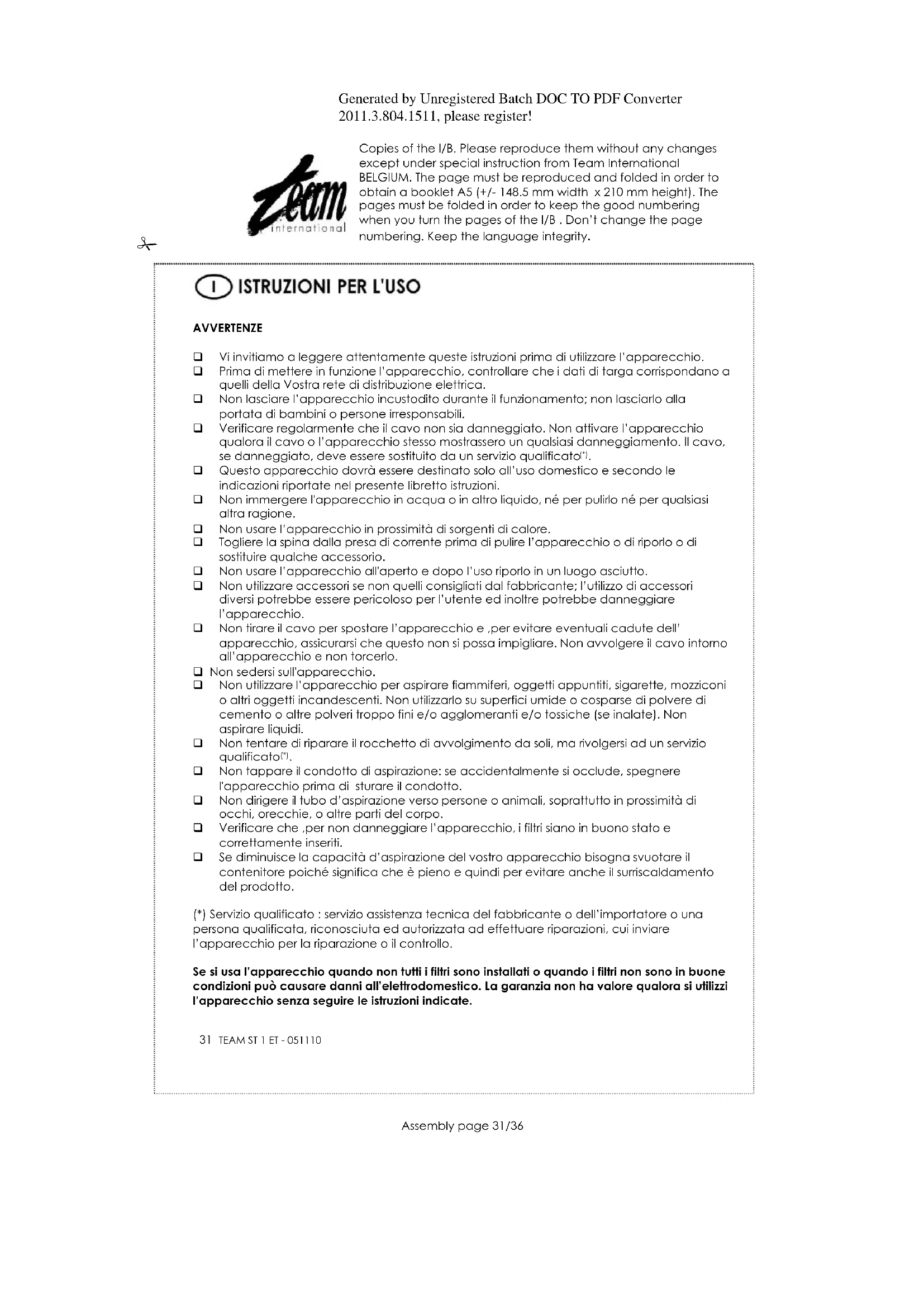 Non tappare il condotto di aspirazione: se accidentalmente si occlude, spegnere l'apparecchio prima di sturare il condotto. Non dirigere il tubo d‟aspirazione verso persone o animali, soprattutto in prossimità di occhi, orecchie, o altre parti del corpo. Verificare che ,per non danneggiare l‟apparecchio, i filtri siano in buono stato e correttamente inseriti. Se diminuisce la capacità d‟aspirazione del vostro apparecchio bisogna svuotare il contenitore poiché significa che è pieno e quindi per evitare anche il surriscaldamento del prodotto. (*) Servizio qualificato : servizio assistenza tecnica del fabbricante o dell‟importatore o una persona qualificata, riconosciuta ed autorizzata ad effettuare riparazioni, cui inviare l‟apparecchio per la riparazione o il controllo. Se si usa l’apparecchio quando non tutti i filtri sono installati o quando i filtri non sono in buone condizioni può causare danni all’elettrodomestico. La garanzia non ha valore qualora si utilizzi l’apparecchio senza seguire le istruzioni indicate.Generated by Unregistered Batch DOC TO PDF Converter 2011.3.804.1511, please register! Copies of the I/B. Please reproduce them without any changes except under special instruction from Team International BELGIUM. The page must be reproduced and folded in order to obtain a booklet A5 (+/- 148.5 mm width x 210 mm height). The pages must be folded in order to keep the good numbering when you turn the pages of the I/B . Don‟t change the page numbering. Keep the language integrity.