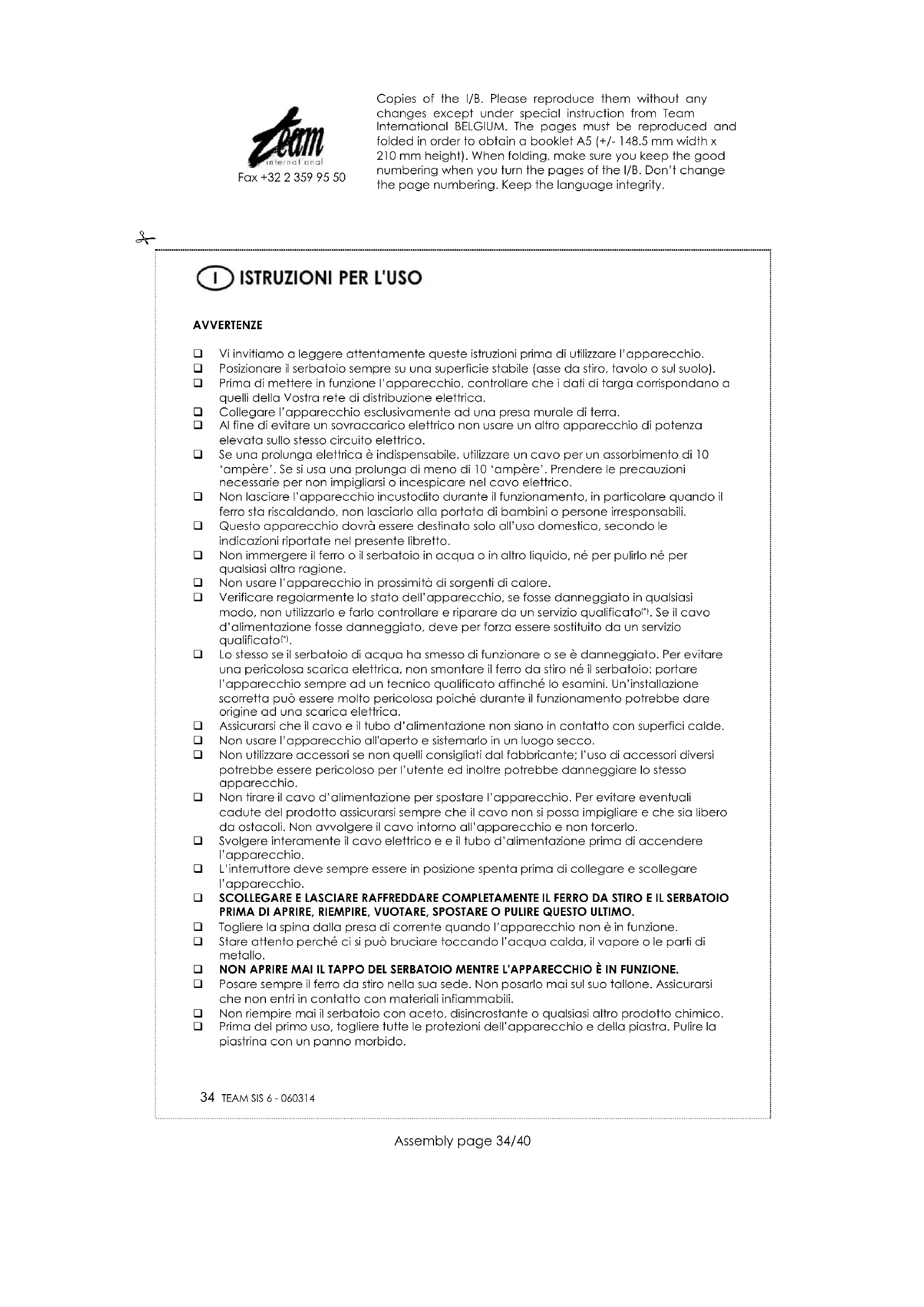 Lo stesso se il serbatoio di acqua ha smesso di funzionare o se è danneggiato. Per evitare una pericolosa scarica elettrica, non smontare il ferro da stiro né il serbatoio: portare l‟apparecchio sempre ad un tecnico qualificato affinché lo esamini. Un‟installazione scorretta può essere molto pericolosa poiché durante il funzionamento potrebbe dare origine ad una scarica elettrica. Assicurarsi che il cavo e il tubo d‟alimentazione non siano in contatto con superfici calde. Non usare l‟apparecchio all'aperto e sistemarlo in un luogo secco. Non utilizzare accessori se non quelli consigliati dal fabbricante; l‟uso di accessori diversi potrebbe essere pericoloso per l‟utente ed inoltre potrebbe danneggiare lo stesso apparecchio. Non tirare il cavo d‟alimentazione per spostare l‟apparecchio. Per evitare eventuali cadute del prodotto assicurarsi sempre che il cavo non si possa impigliare e che sia libero da ostacoli. Non avvolgere il cavo intorno all‟apparecchio e non torcerlo. Svolgere interamente il cavo elettrico e e il tubo d‟alimentazione prima di accendere l‟apparecchio. L‟interruttore deve sempre essere in posizione spenta prima di collegare e scollegare l‟apparecchio. SCOLLEGARE E LASCIARE RAFFREDDARE COMPLETAMENTE IL FERRO DA STIRO E IL SERBATOIO PRIMA DI APRIRE, RIEMPIRE, VUOTARE, SPOSTARE O PULIRE QUESTO ULTIMO. Togliere la spina dalla presa di corrente quando l‟apparecchio non è in funzione. Stare attento perché ci si può bruciare toccando l‟acqua calda, il vapore o le parti di metallo. NON APRIRE MAI IL TAPPO DEL SERBATOIO MENTRE L’APPARECCHIO È IN FUNZIONE. Posare sempre il ferro da stiro nella sua sede. Non posarlo mai sul suo tallone. Assicurarsi che non entri in contatto con materiali infiammabili. Non riempire mai il serbatoio con aceto, disincrostante o qualsiasi altro prodotto chimico. Prima del primo uso, togliere tutte le protezioni dell‟apparecchio e della piastra. Pulire la piastrina con un panno morbido. Copies of the I/B. Please reproduce them without any changes except under special instruction from Team International BELGIUM. The pages must be reproduced and folded in order to obtain a booklet A5 (+/- 148.5 mm width x 210 mm height). When folding, make sure you keep the good numbering when you turn the pages of the I/B. Don‟t change the page numbering. Keep the language integrity.