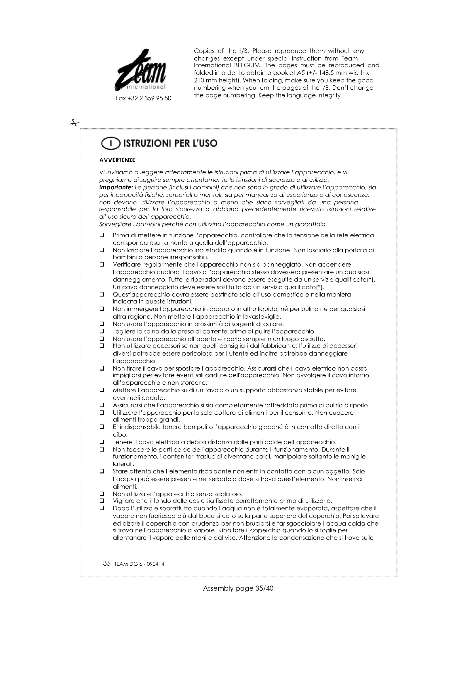 DIRETTIVA 2002/96/CE SULLO SMALTIMENTO DI APPARECCHI ELETTRICI ED ELETTRONICI Per preservare l'ambiente e la nostra salute, l'eliminazione dei vecchi apparecchi elettrici ed elettronici non più utilizzati, va fatta secondo la direttiva sopra citata che impone l'obbligo al costruttore, al commerciante e all’utilizzatore di consegnare gli apparecchi ai centri di raccolta specializzati, i quali saranno in grado di smaltire e riciclare i vecchi prodotti come la legge prescrive. Per questa ragione troverete apposto sull’etichetta segnaletica il simbolo che indica di non gettare il vecchio apparecchio non più utilizzato, in pattumiera o nel cassonetto delle immondizie. Per eliminare il vecchio apparecchio non più utilizzato, potete consegnarlo al rivenditore il cambio di quello nuovo acquistato, o direttamente nei centri di raccolta specializzati messi a disposizione dal vostro comune di residenza. Copies of the I/B. Please reproduce them without any changes except under special instruction from Team International BELGIUM. The pages must be reproduced and folded in order to obtain a booklet A5 (+/- 148.5 mm width x 210 mm height). When folding, make sure you keep the good numbering when you turn the pages of the I/B. Don’t change the page numbering. Keep the language integrity.
