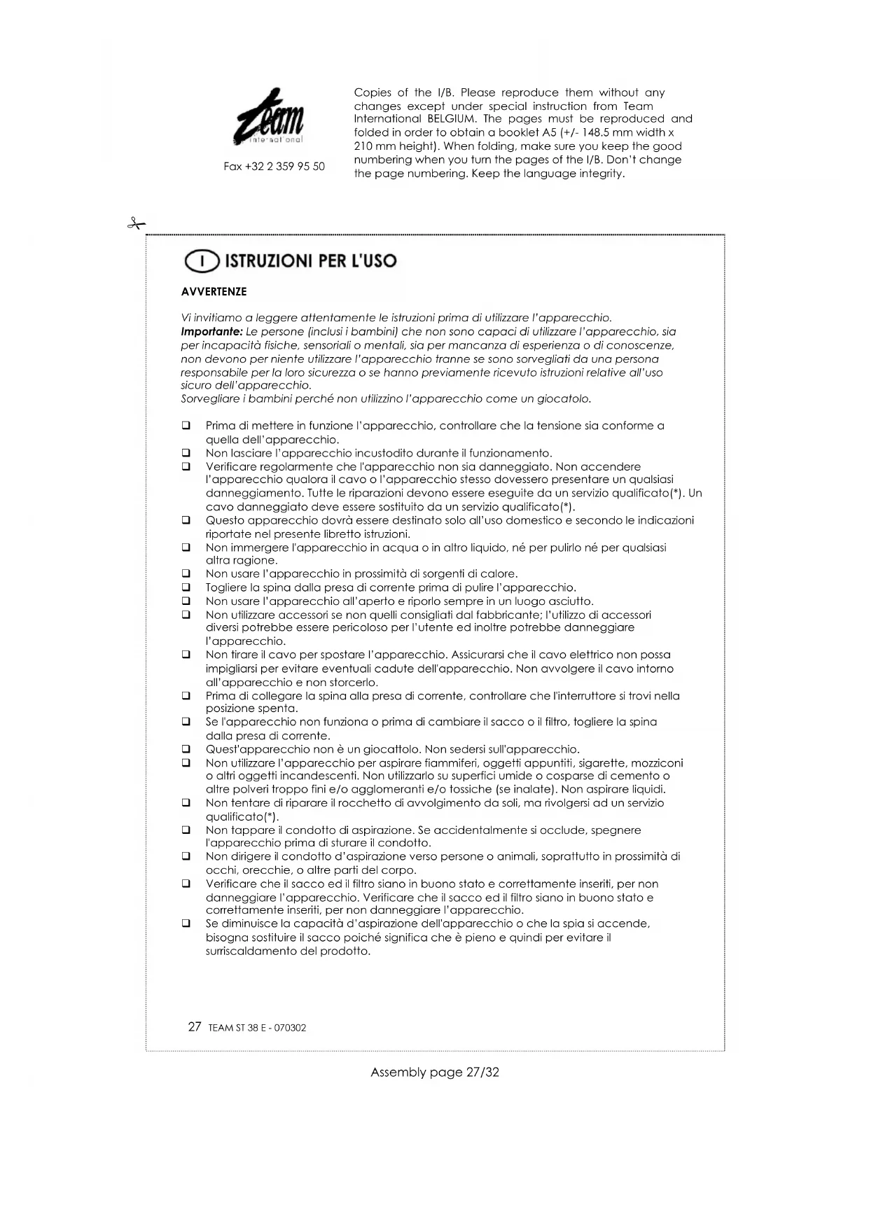 Fax +32 2 359 95 50 DIRETTIVA 2002/96/CE PER LO SMALTIMENTO DELLE APPARECCHIATURE ELETTRICHE ED ELETTRONICHE Per preservare l'ambiente e la nostra salute, l'eliminazione dei vecchi apparecchi elettrici ed elettronici non più utilizzati, va fatta secondo la direttiva sopra citata che impone l'obbligo al costruttore, al commerciante ed all'utilizzatore di consegnare gli apparecchi ai centri di raccolta specializzati, i quali saranno in grado di smaltire e riciclare i vecchi prodotti come la legge prescrive. Per questa ragione troverete apposto sull’etichetta segnaletica il simbolo che indica di non gettare il vecchio apparecchio non più utilizzato, in pattumiera o nel cassonetto delle immondizie. Potrete smaltire il vecchio apparecchio consegnandolo direttamente al rivenditore dove andrete ad acquistarne uno nuovo, o direttamente nei centri di raccolta specializzati messi a disposizione dal vostro comune di residenza. Copies of the I/B. Please reproduce them without any changes except under special instruction from Team International BELGIUM. The pages must be reproduced and folded in order to obtain a booklet A5 (+/- 148.5 mm width x 210 mm height). When folding, make sure you keep the good numbering when you turn the pages of the I/B. Don’t change the page numbering. Keep the language integrity.