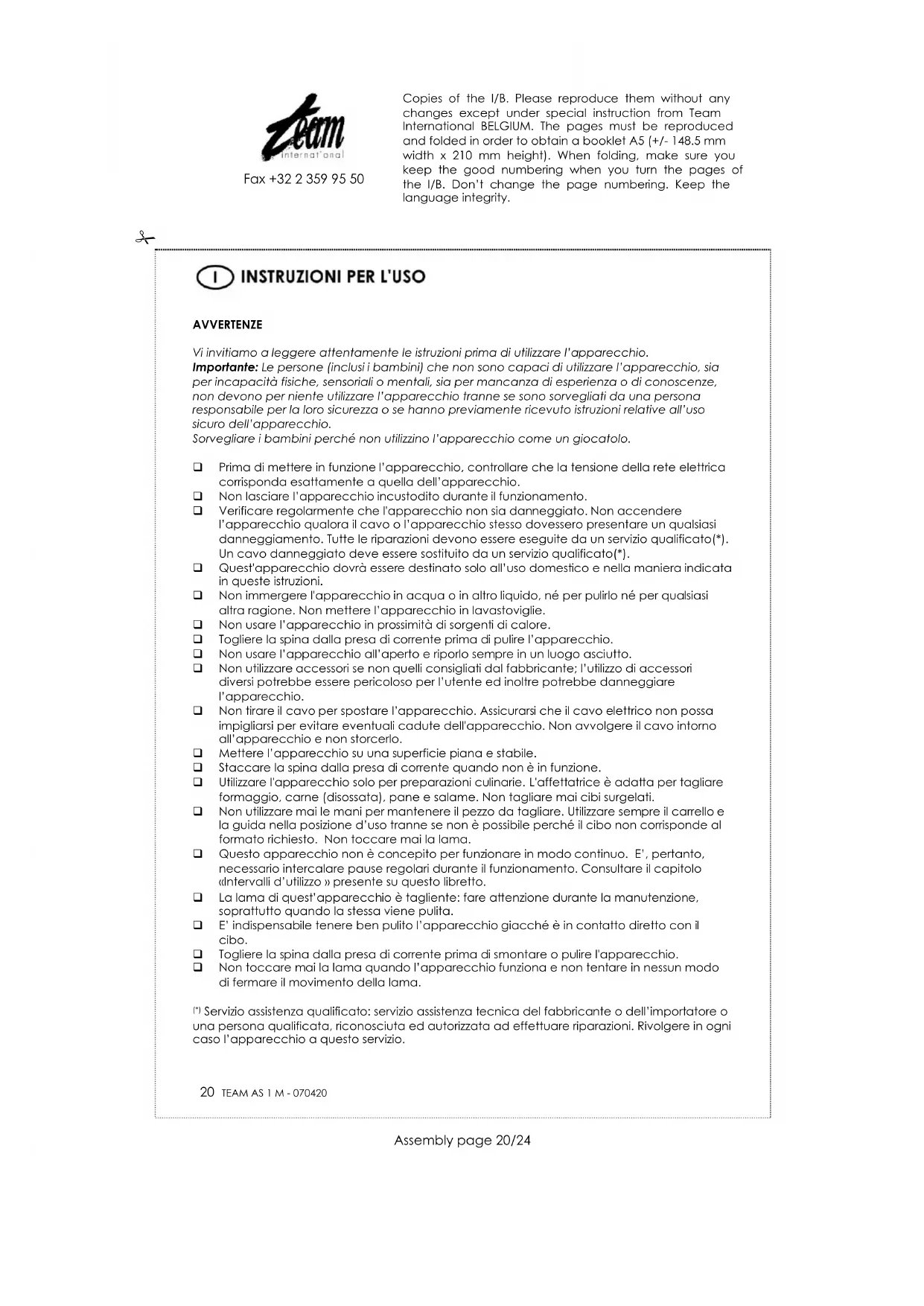 Fax +32 2 359 95 50 DIRETTIVA 2002/96/CE PER LO SMALTIMENTO DELLE APPARECCHIATURE ELETTRICHE ED ELETTRONICHE Per preservare l'ambiente e la nostra salute, l'eliminazione dei vecchi apparecchi elettrici e elettronici non più utilizzati, va fatta secondo la direttiva sopra citata che impone l'obbligo al costruttore, al commerciante e a l'utilizzatore di consegnare gli apparecchi ai centri di raccolta specializzati, i quali saranno in grado di smaltire e riciclare i vecchi prodotti come la legge prescrive. Per questa ragione troverete apposto sulla etichetta segnaletica il simbolo che indica di non gettare il vecchio apparecchio non più utilizzato, in pattumiera o nel cassonetto delle immondizie. Per eliminare il vecchio apparecchio non più utilizzato, potete consegnarlo al rivenditore il cambio di quello nuovo acquistato, o direttamente nei centri di raccolta specializzati messi a disposizione dal vostro comune di residenza. Copies of the I/B. Please reproduce them without any changes except under special instruction from Team International BELGIUM. The pages must be reproduced and folded in order to obtain a booklet A5 (+/- 148.5 mm width x 210 mm height). When folding, make sure you keep the good numbering when you turn the pages of the I/B. Don’t change the page numbering. Keep the language integrity.