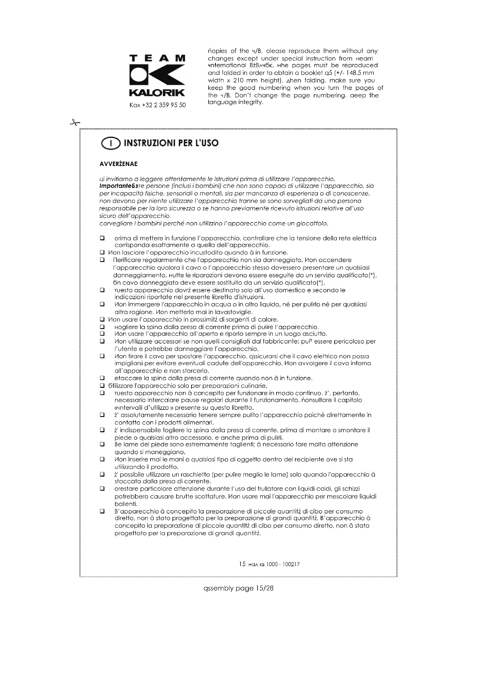 Fax +32 2 359 95 50 Non toccare mai la lama quando l’apparecchio funziona e non tentare in nessun modo di fermare il movimento della lama.