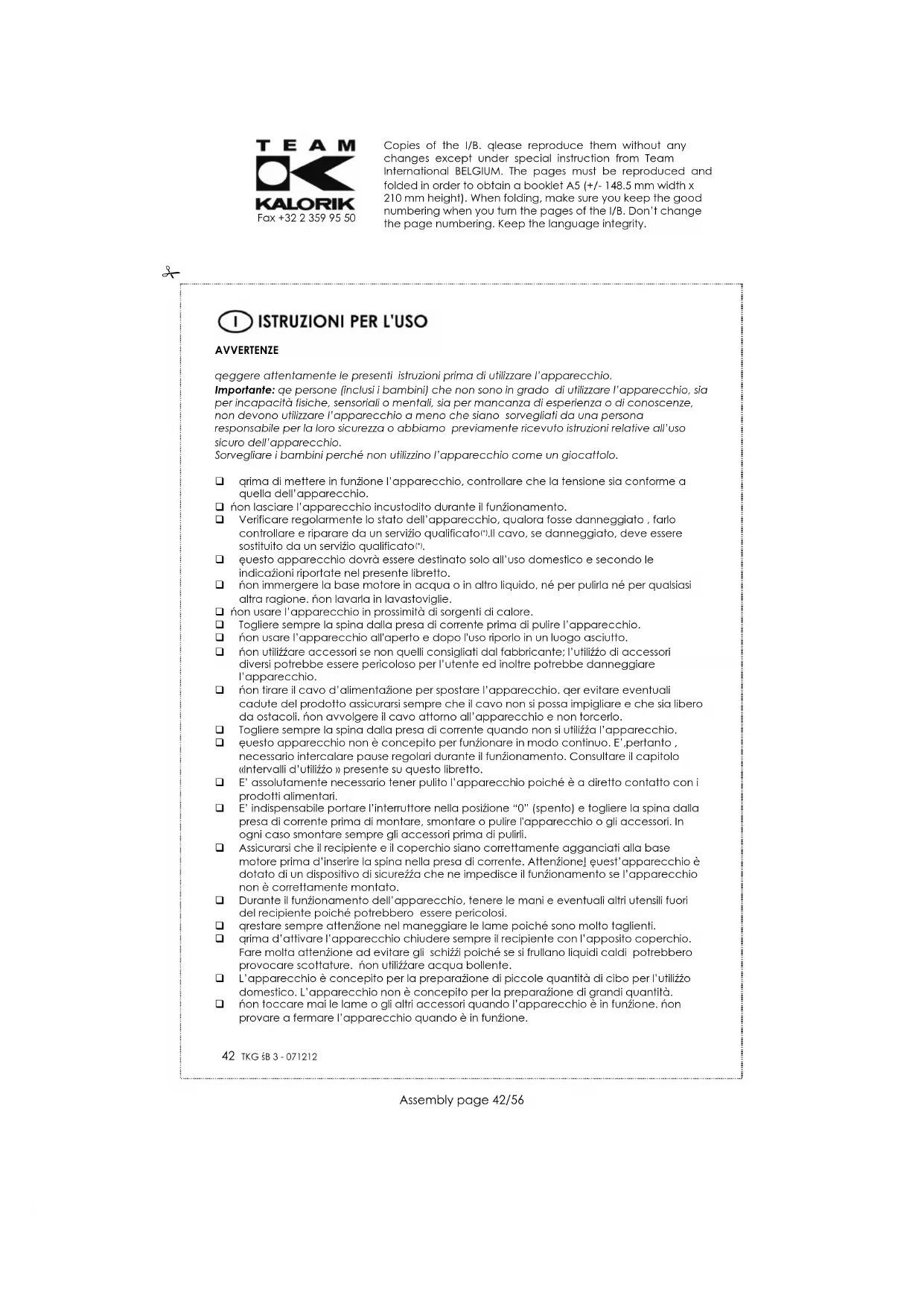 Fax +32 2 359 95 50 Utilizzare sempre l’apposito mortaio per comprimere gli ingredienti inseriti nella tubo di riempimento del coperchio del recipiente. Non bloccare mai le sicurezze dell’apparecchio. Il recipiente del robot può essere lavato in lavastoviglie o con un getto d’acqua. Stare sempre attenti a non ferirsi con le lame nel ritirare o lavare gli accessori.