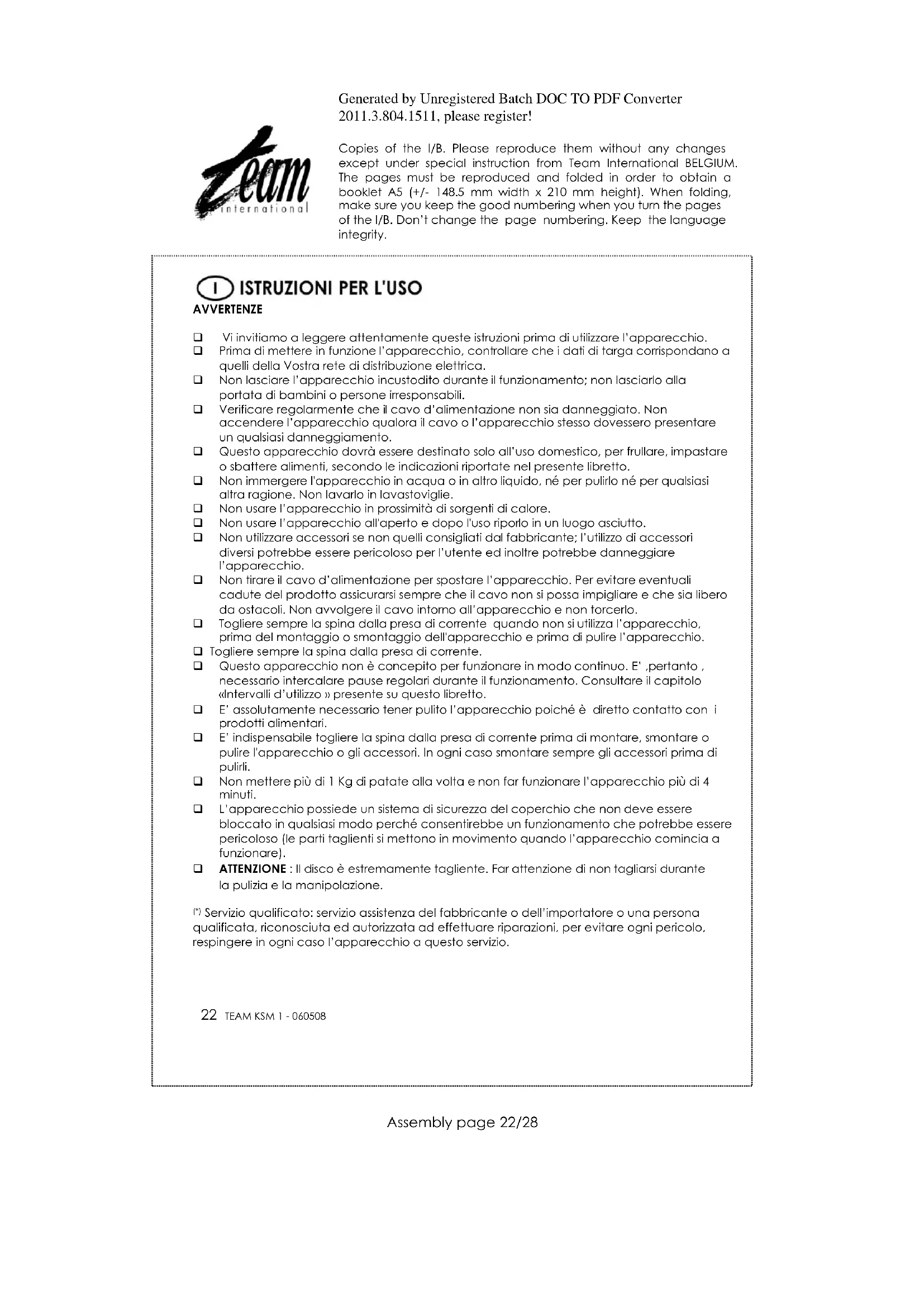 Non tentare di bloccare la sicurezza del coperchio in qualsiasi modo perché consentirebbe di accedere alle parti taglienti in movimento. PULIZIA Il pelapatate elettrico non richiede nessuna manutenzione speciale. Scollegare la spina dalla presa di corrente prima di iniziare la pulizia dell’apparecchio. Tutte le parti staccabili possono essere lavate alla mano o in una lavastoviglie. Non utilizzare prodotti o polveri abrasive. Non immergere mai il blocco motore in acqua. Utilizzare un panno leggermente inumidito. DIRETTIVA 2002/96/CE SULLO SMALTIMENTO DI APPARECCHI ELETTRICI ED ELETTRONICI Per preservare l'ambiente e la nostra salute, l'eliminazione dei vecchi apparecchi elettrici e elettronici non più utilizzati, va fatta secondo la direttiva sopra citata che impone l'obbligo al costruttore, al commerciante e all’utilizzatore di consegnare gli apparecchi ai centri di raccolta specializzati, i quali saranno in grado di smaltire e riciclare i vecchi prodotti come la legge prescrive. Per questa ragione troverete apposto sull’etichetta segnaletica il simbolo che indica di non gettare il vecchio apparecchio non più utilizzato, in pattumiera o nel cassonetto delle immondizie. Per eliminare il vecchio apparecchio non più utilizzato, potete consegnarlo al rivenditore il cambio di quello nuovo acquistato, o direttamente nei centri di raccolta specializzati messi a disposizione dal vostro comune di residenza.Generated by Unregistered Batch DOC TO PDF Converter 2011.3.804.1511, please register! Copies of the I/B. Please reproduce them without any changes except under special instruction from Team International BELGIUM. The pages must be reproduced and folded in order to obtain a booklet A5 (+/- 148.5 mm width x 210 mm height). When folding, make sure you keep the good numbering when you turn the pages of the I/B. Don’t change the page numbering. Keep the language integrity.