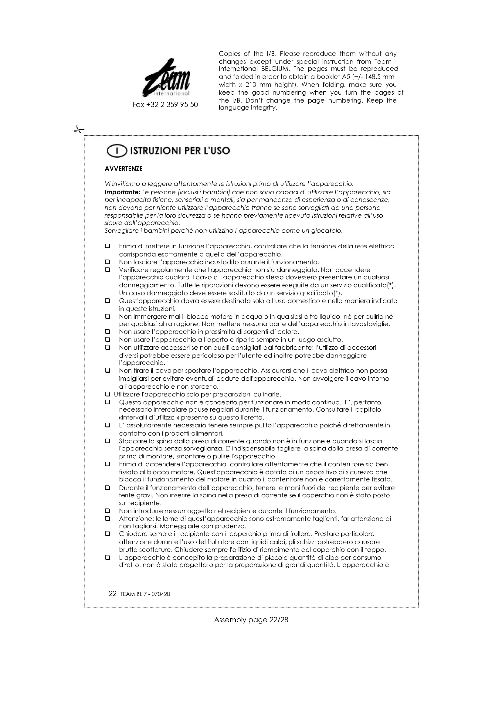 Fax +32 2 359 95 50 Per pulire il recipiente prima di riporlo, toglierlo dal blocco motore e ruotare in senso antiorario il supporto delle lame per staccarlo (così la pulizia sarà più facile). Poi lavare il tutto con un normale detergente per stoviglie e risciacquare con acqua chiara. Asciugare bene prima di rimontare l’apparecchio. Perciò, avvitare il supporto delle lame ruotandolo nel senso orario nel fondo del recipiente (stringere energicamente per evitare le perdite). Stare attento a non smarrire la guarnizione di tenuta stagna durante questo processo. Per la pulizia del corpo motore utilizzare un panno leggermente umido. DIRETTIVA 2002/96/CE PER LO SMALTIMENTO DELLE APPARECCHIATURE ELETTRICHE ED ELETTRONICHE Per preservare l'ambiente e la nostra salute, l'eliminazione dei vecchi apparecchi elettrici ed elettronici non più utilizzati, va fatta secondo la direttiva sopra citata che impone l'obbligo al costruttore, al commerciante ed all'utilizzatore di consegnare gli apparecchi ai centri di raccolta specializzati, i quali saranno in grado di smaltire e riciclare i vecchi prodotti come la legge prescrive. Per questa ragione troverete apposto sull’etichetta segnaletica il simbolo che indica di non gettare il vecchio apparecchio non più utilizzato, in pattumiera o nel cassonetto delle immondizie. Potrete smaltire il vecchio apparecchio consegnandolo direttamente al rivenditore dove andrete ad acquistarne uno nuovo, o direttamente nei centri di raccolta specializzati messi a disposizione dal vostro comune di residenza. Copies of the I/B. Please reproduce them without any changes except under special instruction from Team International BELGIUM. The pages must be reproduced and folded in order to obtain a booklet A5 (+/- 148.5 mm width x 210 mm height). When folding, make sure you keep the good numbering when you turn the pages of the I/B. Don’t change the page numbering. Keep the language integrity.
