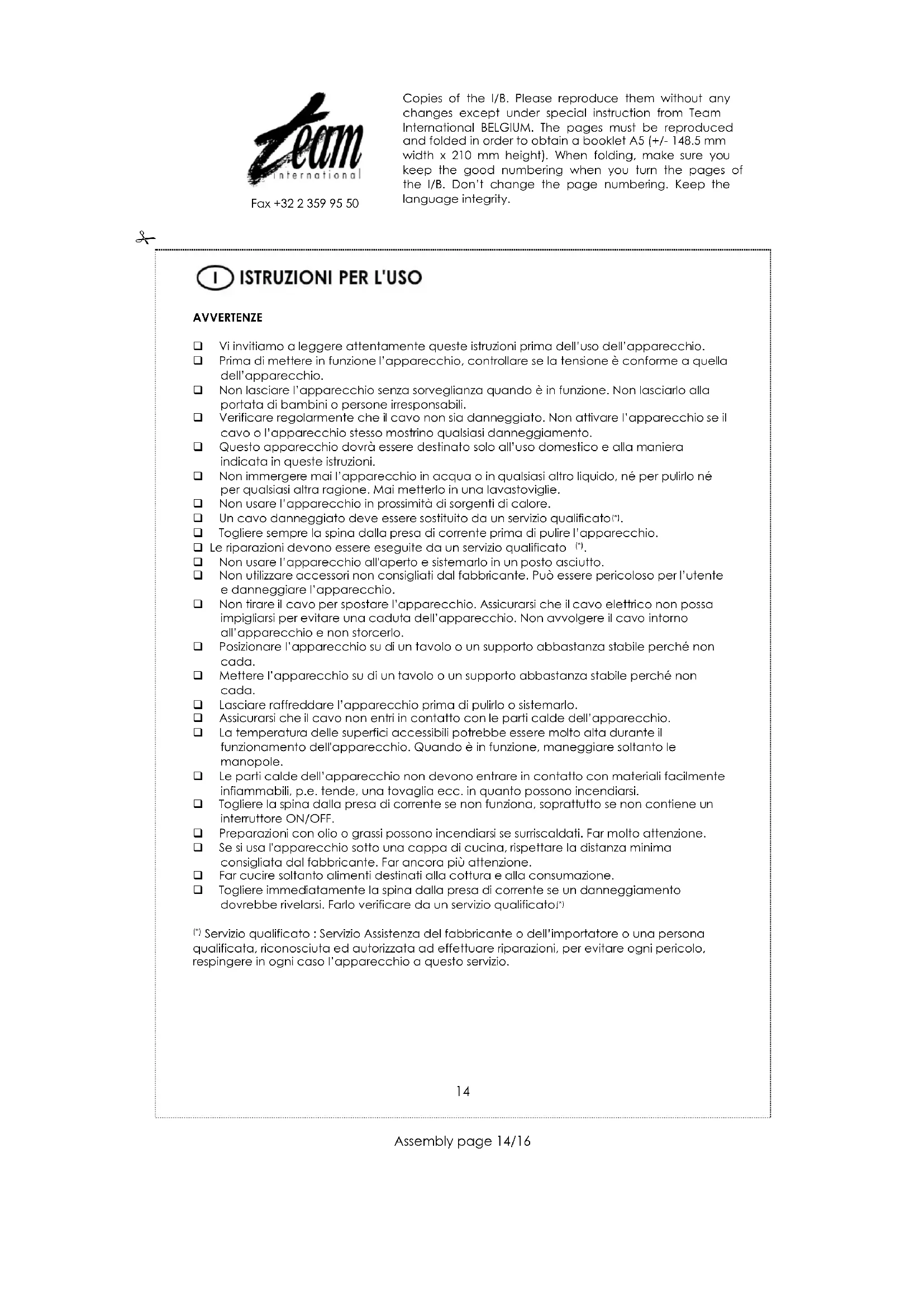 Togliere la spina dalla presa di corrente ed aspettare che l‟apparecchio si raffreddi prima di pulirlo. Asciugare l‟apparecchio con della carta assorbente o un panno morbido. Non pulire mai l‟apparecchio con pagliette metalliche o prodotti abrasivi per non rovinare il rivestimento. Non immergere l'apparecchio in acqua o in altri liquidi. Copies of the I/B. Please reproduce them without any changes except under special instruction from Team International BELGIUM. The pages must be reproduced and folded in order to obtain a booklet A5 (+/- 148.5 mm width x 210 mm height). When folding, make sure you keep the good numbering when you turn the pages of the I/B. Don‟t change the page numbering. Keep the language integrity.