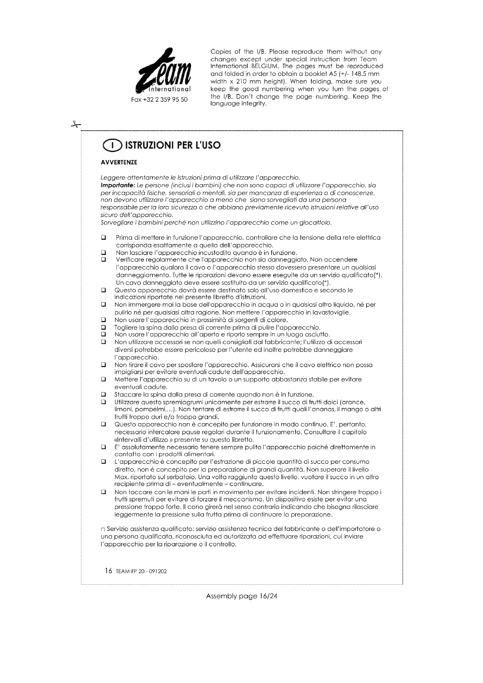Fax +32 2 359 95 50 Per questa ragione troverete apposto sulla etichetta segnaletica il simbolo che indica di non gettare il vecchio apparecchio non più utilizzato, in pattumiera o nel cassonetto delle immondizie. Per eliminare il vecchio apparecchio non più utilizzato, potete consegnarlo al rivenditore il cambio di quello nuovo acquistato, o direttamente nei centri di raccolta specializzati messi a disposizione dal vostro comune di residenza. Copies of the I/B. Please reproduce them without any changes except under special instruction from Team International BELGIUM. The pages must be reproduced and folded in order to obtain a booklet A5 (+/- 148.5 mm width x 210 mm height). When folding, make sure you keep the good numbering when you turn the pages of the I/B. Don’t change the page numbering. Keep the language integrity.