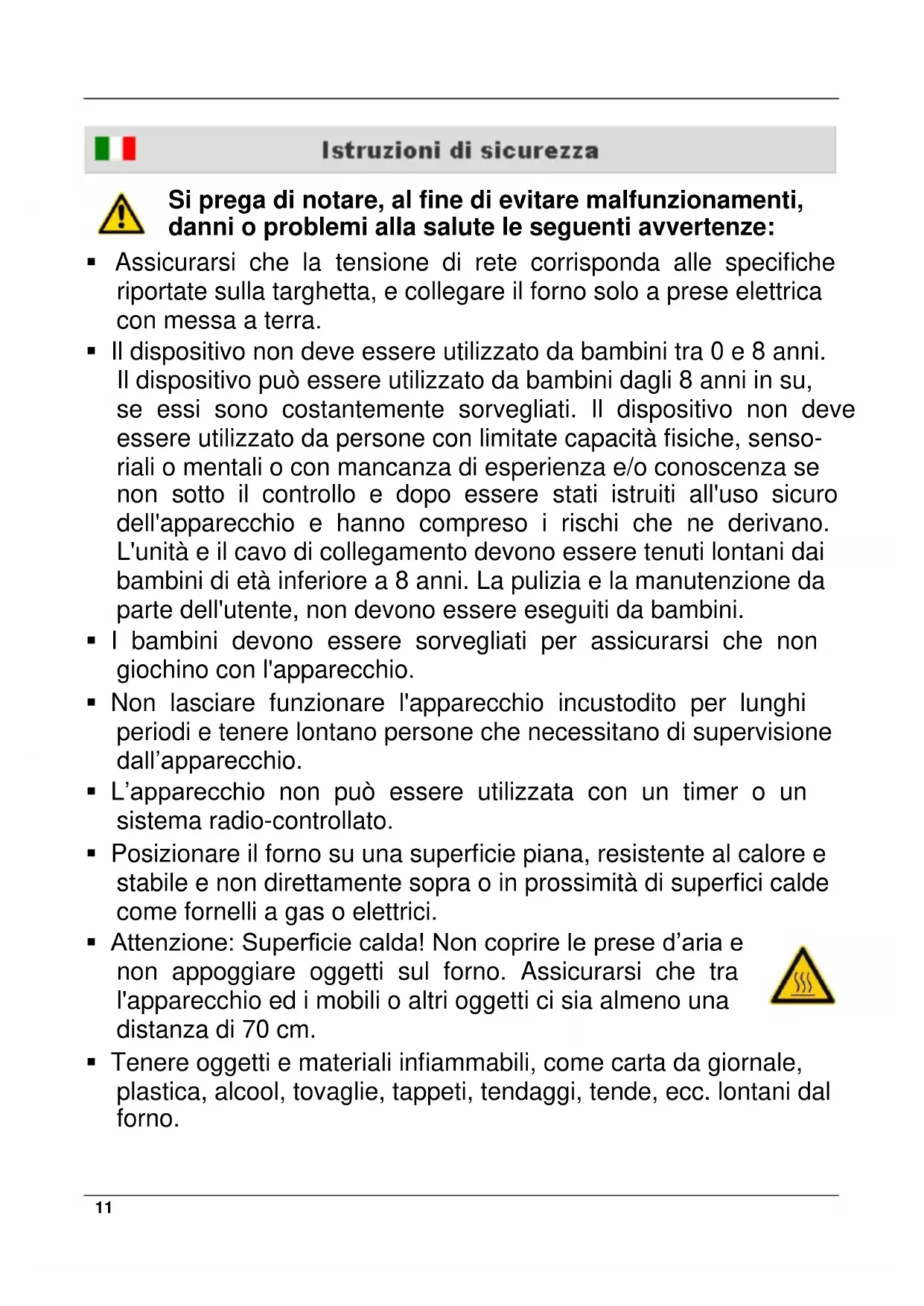 L'appareil n'est pas destiné à un usage commercial. L'appareil peut être utilisé à l'intérieur pour une usage domestique et simi- laire, comme dans la cuisine du personnel dans les magasins, les bureaux et autres espaces commerciaux et dans les proprié- tés agricoles. En outre, l'appareil peut être utilisé par les clients dans les hôtels, motels et autres structures résidentielles et dans le B & B. Utilisez l’appareil seulement pour son utilisation prévu. Toute autre utilisation ou une utilisation au-delà de celle prévue sera considérée comme impropre. En cas de dommages à l'appareil, ne l'utilisez pas et laissez-le réparer par un technicien qualifié ou contactez notre service à la clientèle. Ne démontez pas l'appareil et ne chercher pas de le réparer. L'appareil est conçu pour une utilisation jusqu'à 2000 m au- dessus du niveau de la mer.11 Assicurarsi che la tensione di rete corrisponda alle specifiche riportate sulla targhetta, e collegare il forno solo a prese elettrica con messa a terra. Il dispositivo non deve essere utilizzato da bambini tra 0 e 8 anni. Il dispositivo può essere utilizzato da bambini dagli 8 anni in su, se essi sono costantemente sorvegliati. Il dispositivo non deve essere utilizzato da persone con limitate capacità fisiche, senso- riali o mentali o con mancanza di esperienza e/o conoscenza se non sotto il controllo e dopo essere stati istruiti all'uso sicuro dell'apparecchio e hanno compreso i rischi che ne derivano. L'unità e il cavo di collegamento devono essere tenuti lontani dai bambini di età inferiore a 8 anni. La pulizia e la manutenzione da parte dell'utente, non devono essere eseguiti da bambini. I bambini devono essere sorvegliati per assicurarsi che non giochino con l'apparecchio. Non lasciare funzionare l'apparecchio incustodito per lunghi periodi e tenere lontano persone che necessitano di supervisione dall’apparecchio. L’apparecchio non può essere utilizzata con un timer o un sistema radio-controllato. Posizionare il forno su una superficie piana, resistente al calore e stabile e non direttamente sopra o in prossimità di superfici calde come fornelli a gas o elettrici. Attenzione: Superficie calda! Non coprire le prese d’aria e non appoggiare oggetti sul forno. Assicurarsi che tra l'apparecchio ed i mobili o altri oggetti ci sia almeno una distanza di 70 cm. Tenere oggetti e materiali infiammabili, come carta da giornale, plastica, alcool, tovaglie, tappeti, tendaggi, tende, ecc. lontani dal forno.