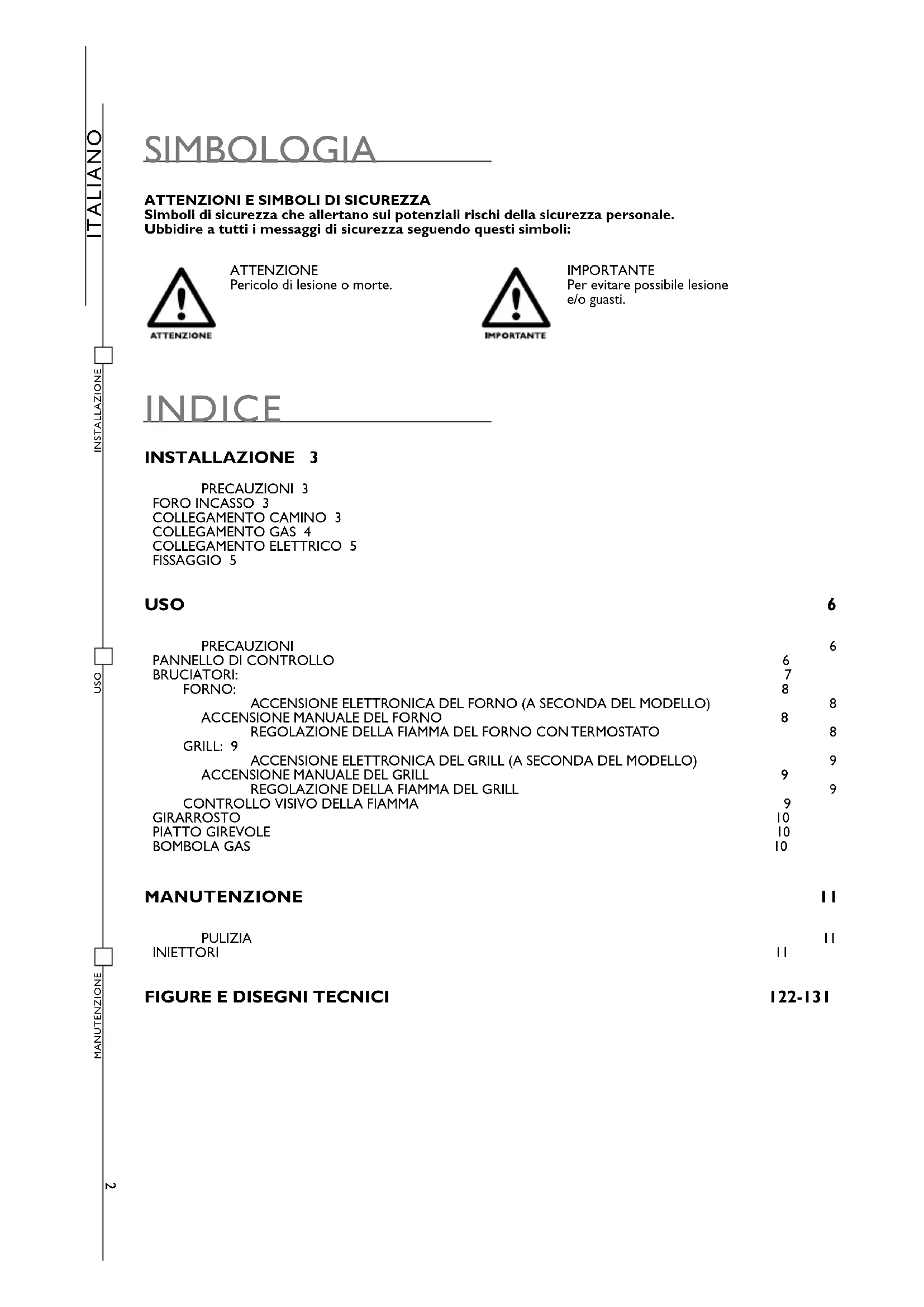 ITALIANO Per generare la fiamma, premere a fondo la manopola di comando e girarla in posizione GRILL o in posizione fiamma grande. Contemporaneamente schiacciare il pulsante accensione elettronica (in quei modelli con il simbolo ★ sulla porta, il pulsante di accensione non è visibile e viene azionato schiacciando la manopola). Una volta generata la fiamma, tenere premuta la manopola per qualche secondo in modo che la fiamma resti accesa. GRILL - ACCENSIONE ELETTRONICA DEL GRILL (A SECONDA DEL MODELLO) L’ACCENSIONE DEL BRUCIATORE DEVE ESSERE EFFETTUATA SOLO CON LA PORTA COMPLETAMENTE APERTA. SE IL BRUCIATORE NON SI ACCENDE IMMEDIATAMENTE RILASCIARE LA MANOPOLA E RIPETERE L’OPERAZIONE DOPO ALMENO 10 SECONDI. LE PARTI ACCESSIBILI POSSONO AVERE TEMPERATURE ELEVATE QUANDO VIENE UTILIZZATO IL GRILL, TENERE LONTANO I BAMBINI. DURANTE IL FUNZIONAMENTO LA PORTA DEVE ESSERE SEMPRE APERTA E IL PARACALORE COMPLETAMENTE ESTRATTO (FIG. 6 - PAG. 130). NON UTILIZZARE MAI IL GRILL PER UN TEMPO SUPERIORE A 25 MINUTI. IL GRILL NON PUO’ ESSERE UTILIZZATO COME UN FORNO. SE LA FIAMMA DEL BRUCIATORE SI SPEGNE ACCIDENTALMENTE CHIUDERE LA MANOPOLA DEL GAS E ATTENDERE UN MINUTO PRIMA DI RIACCENDERE. SE IL BRUCIATORE NON SI ACCENDE IMMEDIATAMENTE RIPETERE L’OPERAZIONE DOPO OGNUNO DEI SEGUENTI SUGGERIMENTI: