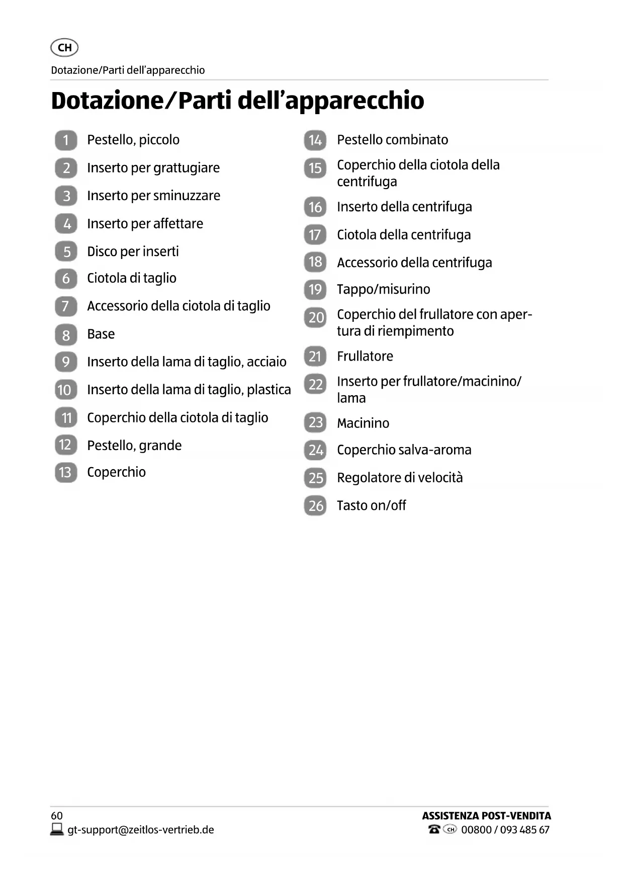 00800 / 093 485 67 ASSISTENZA POST-VENDITA AVVERTENZA! Pericolo di ferimento! Il robot da cucina è dotato di lame affilate e inserti. Le parti dell’ap- parecchio si muovono ad alta velocità. Un utilizzo non conforme alla destinazione d’uso potrebbe provocare danneggiamenti del robot da cucina. − Prestare molta attenzione quando si inserisce o si sostituiscono gli accessori, quando si rimuove il cibo e si effettua la pulizia. Scollegare sempre il robot da cucina dalla spina prima di inserire o sostituire gli accessori. − Non toccare mai le lame di taglio o altre parti taglienti dell’ap- parecchio a mani nude. − Il motore nella base ruota per un attimo anche dopo essere stato spento. Procedere alla rimozione solo al completo arresto del motore. − Non toccare le parti mobili dell’apparecchio né tentare di fer- mare le parti dell’apparecchio a mano o con altri oggetti. − Prestare attenzione che capelli lunghi, gioielli o abiti non ven- gano a contatto con le parti mobili dell’apparecchio. − Non toccare con le mani in frullatore, la ciotola della centrifu- ga o la ciotola di taglio se sono inseriti sulla base e il robot da cucina è collegato alla rete elettrica. − Spingere gli alimenti con il pestello nella ciotola. Non spingere mai gli alimenti con le mani o altri oggetti nella ciotola. − Non usare utensili da cucina per mescolare o recuperare gli ali- menti finché gli accessori sono posizionati sulla base e il robot da cucina è collegato alla rete elettrica. − Accendere il robot da cucina solo dopo aver coperto l’accesso- rio con il relativo coperchio. − Aprire il coperchio quando la lama di taglio e gli inserti sono completamente fermi.Sicurezza