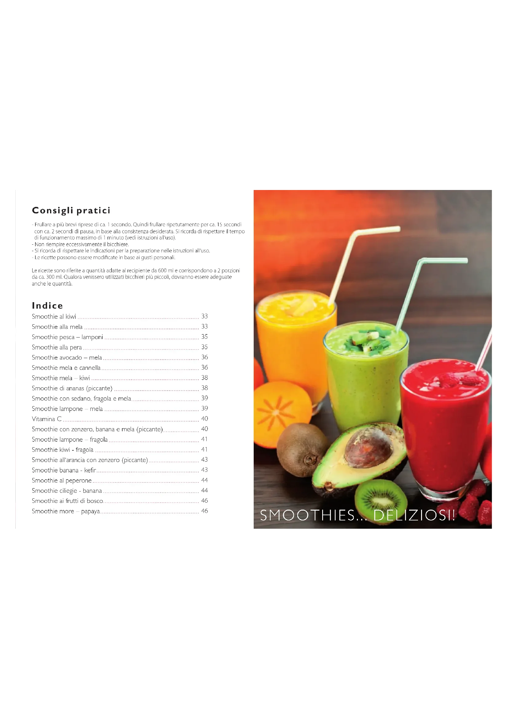 Smoothie all‘arancia con zenzero (piccante) INGREDIENTI - 1 arancia grande (ca. 200 gr. di polpa) - 1/2 banana matura - 15 gr. di zenzero fresco - 100 ml di latte o di latte di soia PREPARAZIONE Sbucciare l‘arancia eliminando completamente anche la parte bianca. Tagliare l‘arancia i pezzi. Sbucciare la banana e tagliarla in pezzi. Sbucciare e grattugiare lo zenzero. Mettere gli ingredienti nel bicchiere e aggiungere il latte o il latte di soia fino al segno max. Frullare brevemente o a impulsi e quindi per massimo 1 minuto, in base alla consistenza desiderata, eventualmente con un breve intervallo. Smoothie kefir - banana INGREDIENTI - 1 banana matura - 400 ml di kefir - 100 ml di acqua - 3 cucchiai di succo di limone o di lime - 3 cucchiai di succo di olivello spinoso PREPARAZIONE Sbucciare la banana, tagliarla in pezzi e metterla nel bicchiere. Versare nel bicchiere il kefir, il succo di lime e di olivello spinoso e aggiungere acqua fino al segno max. Frullare brevemente o a impulsi e quindi per massimo 1 minuto, in base alla consistenza desiderata, eventualmente con un breve intervallo.46 Smoothie ai frutti di boscoja INGREDIENTI - 100 gr. di mirtilli - 180 gr. di lamponi - 2 cucchiai di miele - 300 gr. di yogurt PREPARAZIONE Lavare i mirtilli e i lamponi, selezionarli e asciugarli. Mettere tutti gli ingredienti nel bicchiere. Frullare brevemente o a impulsi e quindi per massimo 1 minuto, in base alla consistenza desiderata, eventualmente con un breve intervallo. Smoothie more - papaya INGREDIENTI - 250 gr. di more - 1 mela - 2 x 50 ml di succo di mela - 1 papaya - 1 cucchiaio di sciroppo d‘acero PREPARAZIONE Lavare le more, selezionarle e asciugarle. Lavare la mela, tagliarla in quarti, mondarla dai semi e tagliarla in piccoli pezzi (lasciare scongelare le more surgelate per ca. 30 minuti). Mettere nel bicchiere le more, i pezzi di mela e la metà del succo di mela. Frullare brevemente o a impulsi e quindi per massimo 1 minuto, in base alla consistenza desiderata, eventualmente con un breve intervallo. Versare lo smoothie in 2 bicchieri grandi. Tagliare in quarti la papaya, eliminare i semi e togliere la buccia. Tagliare in pezzi piccoli. Frullarla brevemente o a impulsi insieme al restante succo di mela e un cucchiaio di sciroppo d‘acero. Quindi per massimo 1 minuto, in base alla consistenza desiderata. Aggiungere lo smoothie di papaya ai bicchieri riempiti a metà. SALUTARE E RINFRESCANTEEigene Rezepte / Vos recettes / Ricette personali