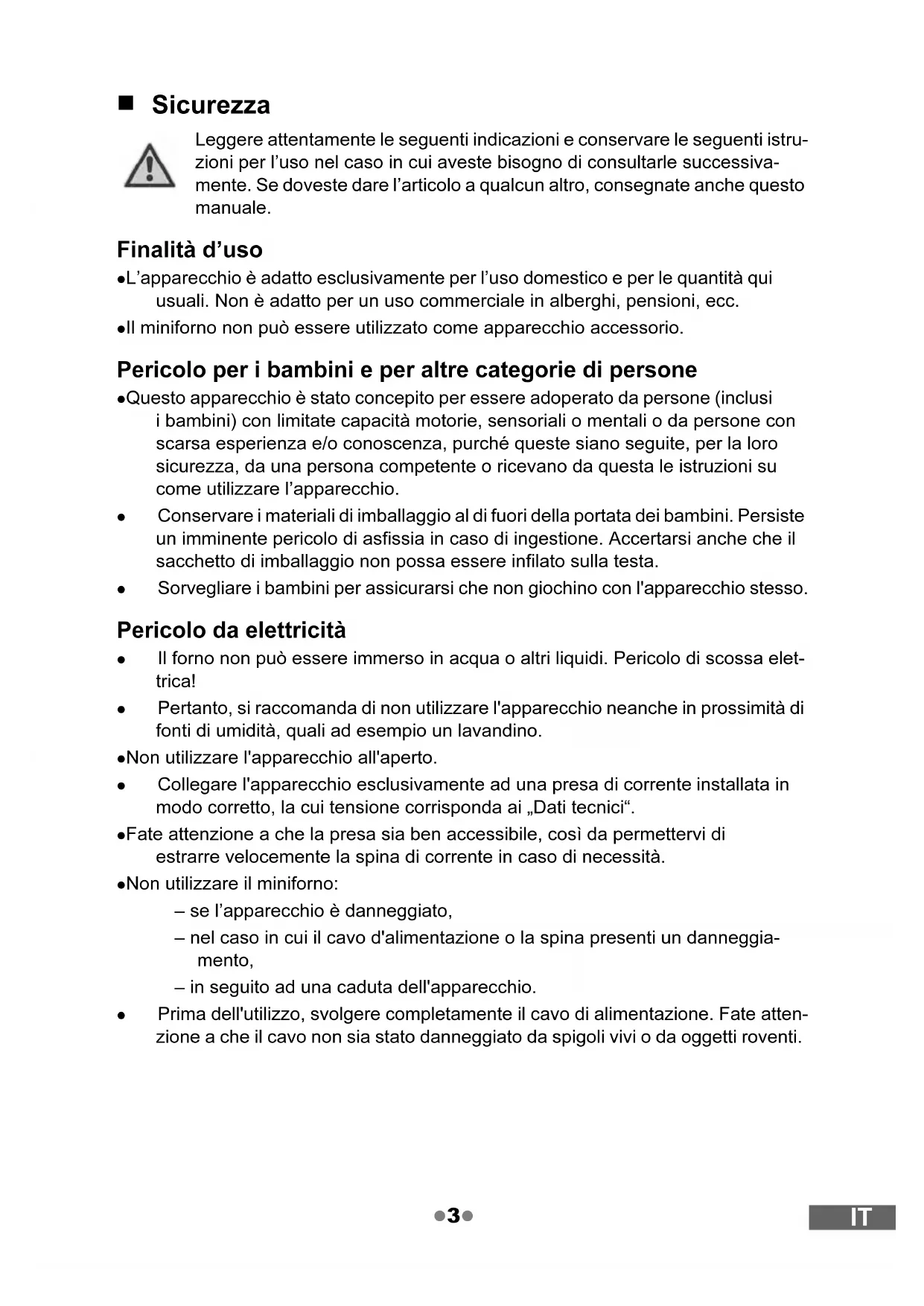 Non posizionare l'apparecchio sotto un pensile o in un angolo. Mantenereanche una sufficiente distance da materiali infiammabili, quali ad esempio tendaggi o tovaglie. - Tenere il miniforno lontano dall'acqua. Questo vale in particolare se il forno è caldo. Lo sportello del forno è di vetro e potrebbe incrinarsi e frantumarsi.
