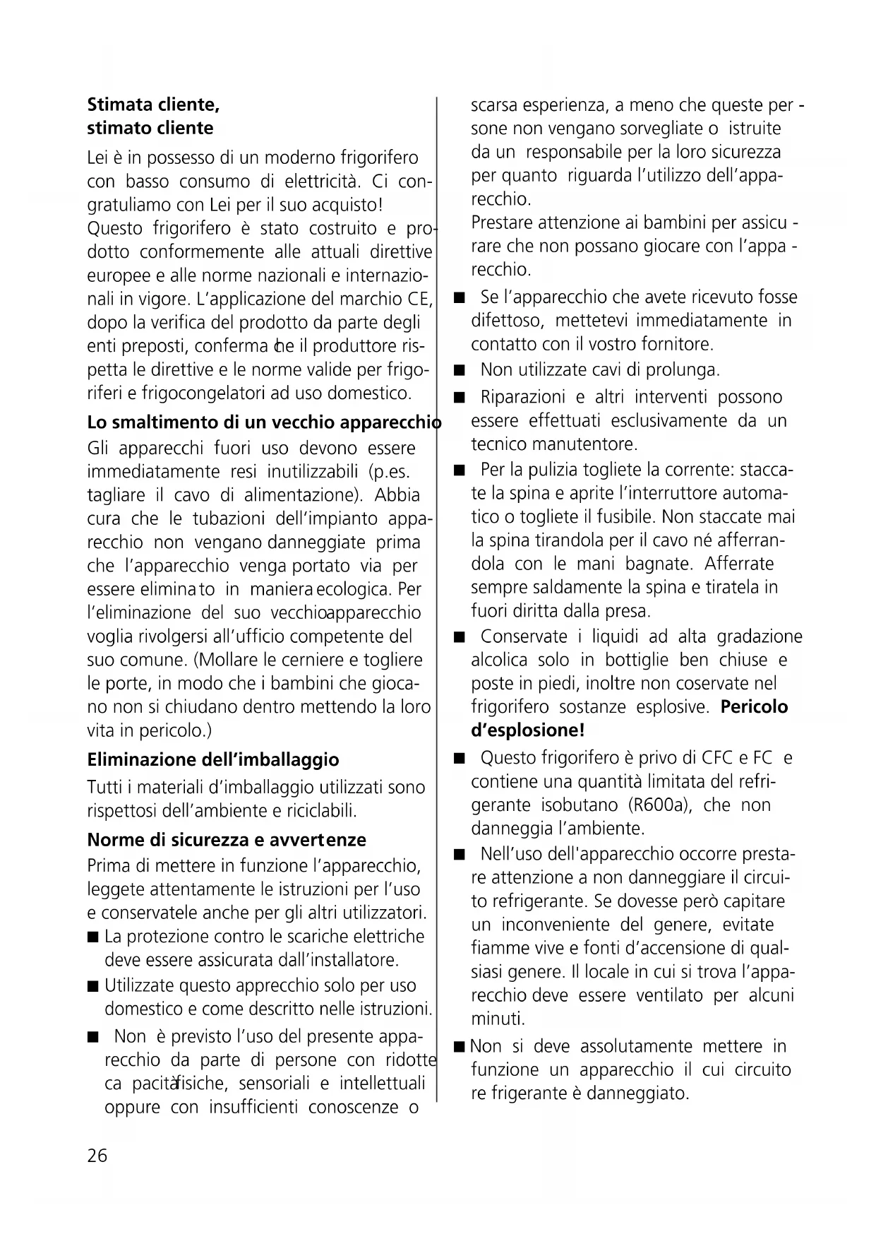 Funzione anomala des sensore: – messaggio d’errore F1 sul display a sini- stra = sensore temperatura frigorifero diffettoso – Messaggio di errore F4 sul display della temperatura a destra (temperatura del vano freezer) = il sensore della tempera- tura del vano freezer è difettoso. – messaggio d’errore F7 sul display a destra = sensore temperatura ambiente diffettoso Funzionamento d’emergenza Quando appare un m essaggio di errore F1 o F4 relativo alle sonde, il funzionamento del frigorifero continua in modalità emer- genza con comando a tempo, indipenden- temente dalle sonde difettose. Garanzia Le concediamo la garanzia a partire dalla data di consegna dell’apparecchio al consu- matore finale. Gli eventuali difetti che durante tale perio - do dovessero manifestarsi, malgrado l’uso conforme alle prescrizioni, e dov uti a un difetto di materiale o di fabbricazione, vengono eliminati dal nostro servizio dopo- vendita, nel quadro della presente garanzia. Non sono coperti da garanzia: – i difetti della lampadina – la rottura di lastre di vetro e parti di plastica – i difetti derivanti da inosservanza delle istruzioni per l’uso improprio – le pretese di risarcimento per danni che superano le nostre prestazioni di garanzia – gli a pparecchi che sono stati riparati da terzi.35 Rumori di funzionamento Rumori del tutto normali Il raffreddamento è assicurato da un com- pressore (generatore del freddo). Il compressore pompa il refrigerante attra - ver so il sistema di refrigerazione. Questo pro cesso è inevitabilmente accompagnato da rumori, che continuano anche dopo lo spegnimento del compressore a causa del- le variazioni di pressione e temperatura. Il presente impianto apparecc hio è stato concepito secondo lo stato più attuale del- le conoscenze ed è stato dotato di un com- pressore molto silenzioso e di un circuito del freddo ottimizzato dal punto di vista della rumorosità. Ciononostante non è possibile evitare com - pletamente determinati rumori, la cui inten - sità dipende dalla dimensione dell'appa- recchio. Tali rumori di funzionamento sono udibili maggiormente subito dopo l’ accensione- del compressore e perdono d’intensità nel corso del funzionamento. Rumori anomali Rumori anomali sono da imputare normal- mente ad un’installazione non adeguata. Il apparecchio deve essere installato o incas- sato orizzontalmente ed in modo stabile. Le tubazioni non devono essere assoluta- mente a contatto con una parete o con altri mobili, come non devono toccarsi tra di loro. In cucine aperte o ppure in presenza di apparecchi inseriti in pareti divisorie dell’am- biente, i normali rumori di funzionamento vengono avvertiti più intensamente. Questo non costituisce un difetto dell'ap- parecchio, ma è semplicemente dovuto alle circostanze architettoniche. Anomalia Causa Annotazione Borbottio Generatore del freddo Normale rumore di funzionamento del generatore del freddo; l’intensità dipende dalla dimensione dell‘apparecchio e dal numero di giri del motore del compressore, che dipende dal carico Ronzio Ventilatore Normale rumore di funzionamento dovuto alla ventilazione Gorgoglio Circuito del freddo Normale rumore di funzionamento dovuto al passaggio del Fruscio refrigerante nel circuito del freddo Fischio Circuito del freddo Normale rumore di funzionamento dovuto all’iniezione del refrigerante nel evaporatore Rumore tipo Termostato Normale rumore di inserimento del regolatore elettro- click meccanico della temperatura o della valvola magnetica I vassoi, cesti o il carico, ecc. sbattono Disponete gli elementi interni in modo che non siano a contatto tra di loro e in modo che i vassoi risultino ben fissati. Scricchiolio della cassa Dilatazioni normali dei materiali dovute alla temperatura, p.es. del materiale sintetico e di quello isolante3637 Dear customer You are the owner of a modern and thus energy-saving refrigerator. Congratulations on your new appliance! This refrigerator has been designed and manufactured to the latest European direc- tives and in accordance with the latest natio- nal and international standards. By affixing the CE mark subsequent to inspection of the product by authorised testing agencies, the manufacturer confirms com pliance with the relevant directives and standards for house- hold refrigerator appliances and household refrigerator/freezer appliances. Disposal of the old appliance Old appliance should be rendered unservi- ceable immediately (e.g. cut off the power cable). Please ensure that the piping of your appliance is not damaged before it is transported to the proper environmentally- friendly disposal facility. Fo r disposal of your old appliance, please contact the appropriate facilities of your local authori- ties. (Unfasten the hinges and remove the doors so that children playing cannot lock themselves in and be in mortal danger). Disposal of the packing material All packing materials used are environ- mentally compatible and recyclable. Safety information and warnings Before putting the appliance into service, ple ase read carefully the information given in the operating instructions and keep them carefully for use by a later owner. ■ Electrical safety must be ensured (contact safety) by the installation. ■ This appliance is only for household use as described in the operating instructions. ■ This appliance is not to be used by per- sons with reduced physical, sensory or mental capacity, or limited experience and un d erstanding, other than when they are supervised or instructed in how to use this appliance by a person respon- sible for their safety. Children should be supervised to ensure that they do not play with the appliance. ■ If you have been supplied with a dama- ged appliance please contact your sup- plier immediately. ■ Do not use an extension cable. ■ Repairs and other service work must only be carried out by a s ervice technician. ■ When cleaning switch off the power supply; pull out the power 