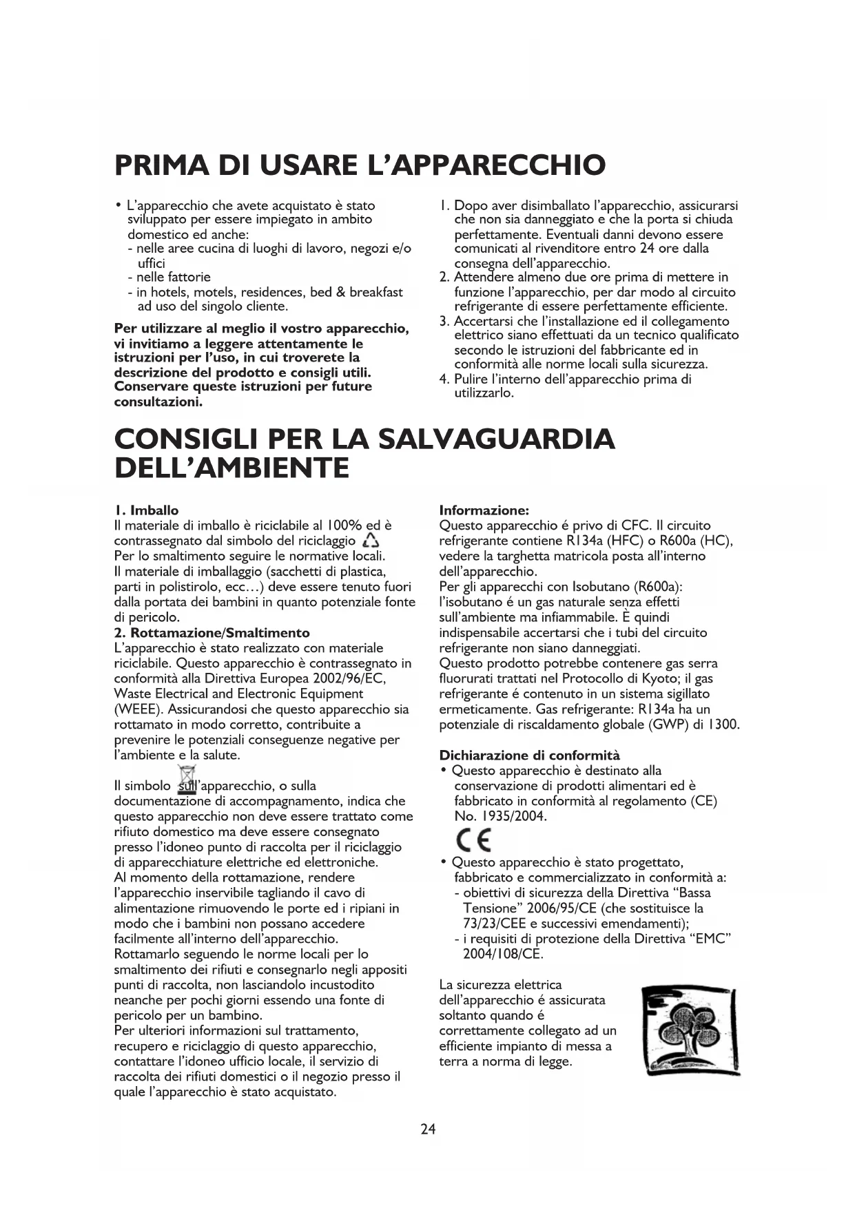 L’apparecchio è stato realizzato con materiale riciclabile. Questo apparecchio è contrassegnato in conformità alla Direttiva Europea 2002/96/EC, Waste Electrical and Electronic Equipment (WEEE). Assicurandosi che questo apparecchio sia rottamato in modo corretto, contribuite a prevenire le potenziali conseguenze negative per l’ambiente e la salute. Il simbolo sull’apparecchio, o sulla documentazione di accompagnamento, indica che questo apparecchio non deve essere trattato come rifiuto domestico ma deve essere consegnato presso l’idoneo punto di raccolta per il riciclaggio di apparecchiature elettriche ed elettroniche. Al momento della rottamazione, rendere l’apparecchio inservibile tagliando il cavo di alimentazione rimuovendo le porte ed i ripiani in modo che i bambini non possano accedere facilmente all’interno dell’apparecchio. Rottamarlo seguendo le norme locali per lo smaltimento dei rifiuti e consegnarlo negli appositi punti di raccolta, non lasciandolo incustodito neanche per pochi giorni essendo una fonte di pericolo per un bambino. Per ulteriori informazioni sul trattamento, recupero e riciclaggio di questo apparecchio, contattare l’idoneo ufficio locale, il servizio di raccolta dei rifiuti domestici o il negozio presso il quale l’apparecchio è stato acquistato. Informazione: Questo apparecchio é privo di CFC. Il circuito refrigerante contiene R134a (HFC) o R600a (HC), vedere la targhetta matricola posta all’interno dell’apparecchio. Per gli apparecchi con Isobutano (R600a): l’isobutano é un gas naturale senza effetti sull’ambiente ma infiammabile. È quindi indispensabile accertarsi che i tubi del circuito refrigerante non siano danneggiati. Questo prodotto potrebbe contenere gas serra fluorurati trattati nel Protocollo di Kyoto; il gas refrigerante é contenuto in un sistema sigillato ermeticamente. Gas refrigerante: R134a ha un potenziale di riscaldamento globale (GWP) di 1300. Dichiarazione di conformità