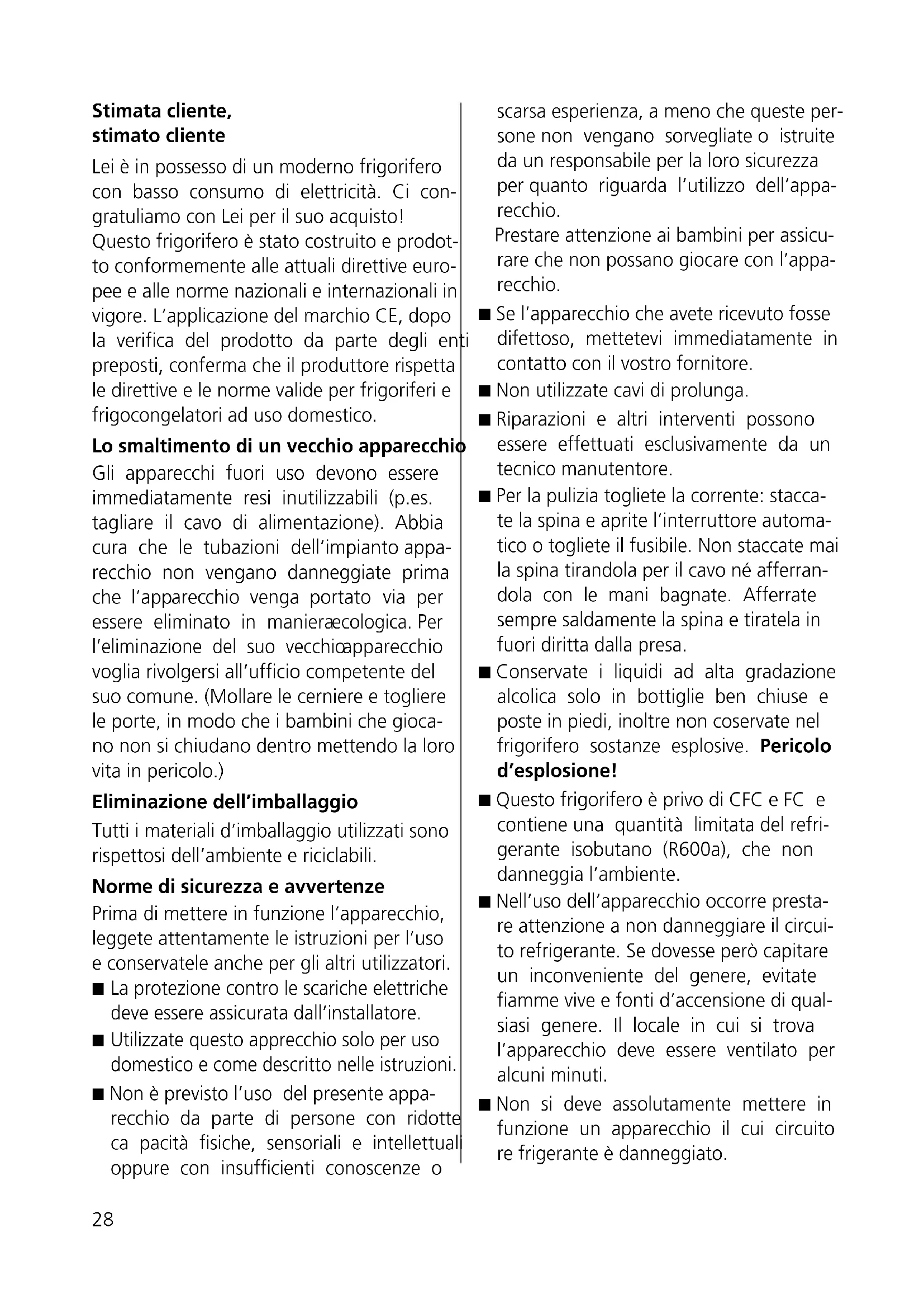aération 10/6-fente4/6-fente Mettre en sûreté électrique (protection contre les contacts acciden- tels) en l’encastrant comme il faut. Si la prise de courant n’est plus accessible après l’encastrement de l’appareil, il faut prévoir un organe de coupure sur l’installation. Comme organe de coupure sont admis les interrupteurs avec une distance de contacts d’au moins 3 mm, les fusibles, les disjoncteurs automatiques et les contacteurs.28 Stimata cliente, stimato cliente Lei è in possesso di un moderno frigorifero con basso consumo di elettricità. Ci con- gratuliamo con Lei per il suo acquisto! Questo frigorifero è stato costruito e prodot- to conformemente alle attuali direttive euro- pee e alle norme nazionali e internazionali in vigore. L’applicazione del marchio CE, dopo la verifica del prodotto da parte degli enti preposti, conferma che il produttore rispetta le direttive e le norme valide per frigoriferi e frigocongelatori ad uso domestico. Lo smaltimento di un vecchio apparecchio Gli apparecchi fuori uso devono essere immediatamente resi inutilizzabili (p.es. tagliare il cavo di alimentazione). Abbia cura che le tubazioni dell’impianto appa- recchio non vengano danneggiate prima che l’apparecchio venga portato via per essere eliminato in maniera ecologica. Per l’eliminazione del suo vecchio apparecchio voglia rivolgersi all’ufficio competente del suo comune. (Mollare le cerniere e togliere le porte, in modo che i bambini che gioca- no non si chiudano dentro mettendo la loro vita in pericolo.) Eliminazione dell’imballaggio Tutti i materiali d’imballaggio utilizzati sono rispettosi dell’ambiente e riciclabili. Norme di sicurezza e avvertenze Prima di mettere in funzione l’apparecchio, leggete attentamente le istruzioni per l’uso e conservatele anche per gli altri utilizzatori.