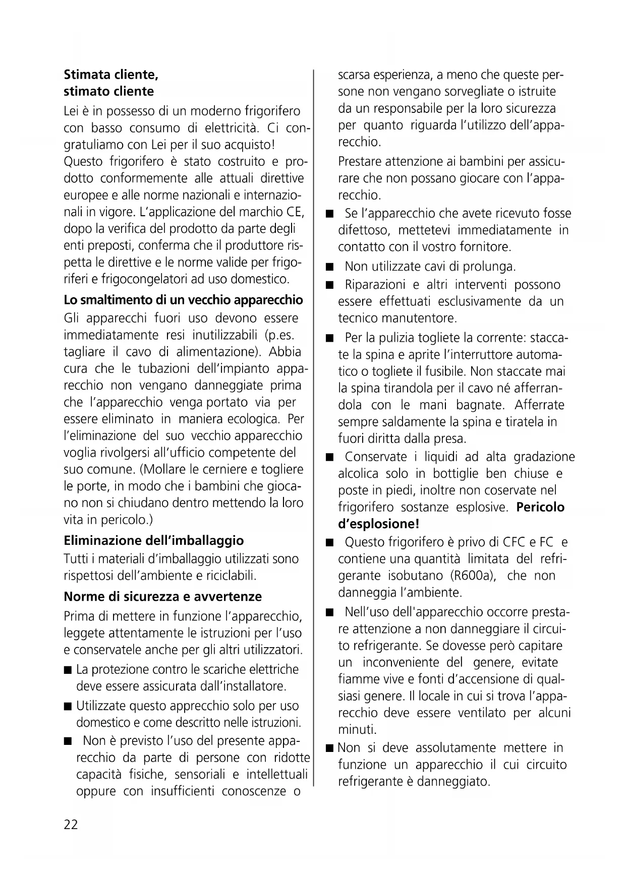 niche 605appareil 545niche 550appareil 548niche 550appareil 548niche 550appareil 548 niche 560–568100° 105° 100°détail A Section d’aération en haut eten bas min. 200 cm Les caractéristiques de performance sontégalement assurées pour les niches deprofondeur 550 889+dépassement deniche en haut -fente/2 635+dépassement de nicheen bas -fente/2 aération7/6-fente5/6-fenteSi la prise de courant n’est plus accessible après l’encastrement del’appareil, il faut prévoir un organe de coupure sur l’installation.Comme organe de coupure sont admis les interrupteurs avec unedistance de contacts d’au moins 3 mm, les fusibles, les disjoncteursautomatiques et les contacteurs. nische SMS 12/6 (1524mm) 1850 SMS-Norm22 Stimata cliente, stimato cliente Lei è in possesso di un moderno frigorifero con basso consumo di elettricità. Ci con- gratuliamo con Lei per il suo acquisto! Questo frigorifero è stato costruito e pro- dotto conformemente alle attuali direttive europee e alle norme nazionali e internazio- nali in vigore. L’applicazione del marchio CE, dopo la verifica del prodotto da parte degli enti preposti, conferma che il produttore ris- petta le direttive e le norme valide per frigo- riferi e frigocongelatori ad uso domestico. Lo smaltimento di un vecchio apparecchio Gli apparecchi fuori uso devono essere immediatamente resi inutilizzabili (p.es. tagliare il cavo di alimentazione). Abbia cura che le tubazioni dell’impianto appa- recchio non vengano danneggiate prima che l’apparecchio venga portato via per essere eliminato in maniera ecologica. Per l’eliminazione del suo vecchio apparecchio voglia rivolgersi all’ufficio competente del suo comune. (Mollare le cerniere e togliere le porte, in modo che i bambini che gioca- no non si chiudano dentro mettendo la loro vita in pericolo.) Eliminazione dell’imballaggio Tutti i materiali d’imballaggio utilizzati sono rispettosi dell’ambiente e riciclabili. Norme di sicurezza e avvertenze Prima di mettere in funzione l’apparecchio, leggete attentamente le istruzioni per l’uso e conservatele anche per gli altri utilizzatori.