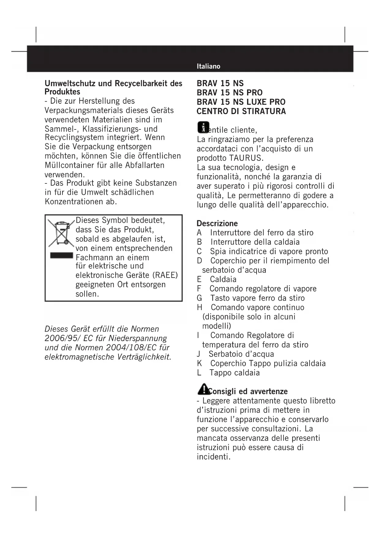 Gentile cliente, La ringraziamo per la preferenza accordataci con l’acquisto di un prodotto TAURUS. La sua tecnologia, design e funzionalità, nonché la garanzia di aver superato i più rigorosi controlli di qualità, Le permetteranno di godere a lungo delle qualità dell’apparecchio. Descrizione A Interruttore del ferro da stiro B Interruttore della caldaia C Spia indicatrice di vapore pronto D Coperchio per il riempimento del serbatoio d’acqua E Caldaia F Comando regolatore di vapore G Tasto vapore ferro da stiro H Comando vapore continuo (disponibile solo in alcuni modelli) I Comando Regolatore di temperatura del ferro da stiro J Serbatoio d’acqua K Coperchio Tappo pulizia caldaia L Tappo caldaia Consigli ed avvertenze - Leggere attentamente questo libretto d’istruzioni prima di mettere in funzione l’apparecchio e conservarlo per successive consultazioni. La mancata osservanza delle presenti istruzioni può essere causa di incidenti. Umweltschutz und Recycelbarkeit des Produktes - Die zur Herstellung des Verpackungsmaterials dieses Geräts verwendeten Materialien sind im Sammel-, Klassifizierungs- und Recyclingsystem integriert. Wenn Sie die Verpackung entsorgen möchten, können Sie die öffentlichen Müllcontainer für alle Abfallarten verwenden. - Das Produkt gibt keine Substanzen in für die Umwelt schädlichen Konzentrationen ab. Dieses Gerät erfüllt die Normen 2006/95/ EC für Niederspannung und die Normen 2004/108/EC für elektromagnetische Verträglichkeit. Dieses Symbol bedeutet, dass Sie das Produkt, sobald es abgelaufen ist, von einem entsprechenden Fachmann an einem für elektrische und elektronische Geräte (RAEE) geeigneten Ort entsorgen sollen.Area di lavoro: - L’apparecchio deve essere collocato ed utilizzato su una superficie piana e stabile. - AVVERTENZA: Per evitare che l’apparecchio si surriscaldi, non deve essere coperto. Sicurezza elettrica: - Non utilizzare l’apparecchio nel caso in cui il cavo di alimentazione o la spina siano danneggiati. - Prima di collegare l’apparecchio alla rete elettrica, verificare che il voltaggio indicato sulla targhetta caratteristiche corrisponda al voltaggio della rete. - Collegare l’apparecchio a una presa di corrente che sopporti come minimo 10 ampere. - Verificare che la presa sia adatta alla spina dell’apparecchio. Non modificare mai la spina e non usare adattatori di spina. - Non usare l’apparecchio se è caduto, se presenta danni visibili o se c’è qualche fuga. - Non tirare il cavo elettrico. Non usarlo mai per sollevare, trasportare o scollegare l’apparecchio. - Non lasciare che il cavo di connessione penda dal tavolo o entri a contatto con le superfici calde dell’apparecchio. - Non toccare mai la spina con le mani bagnate. Precauzioni d’uso: - Prima di ogni utilizzo, svolgere completamente il cavo dell’apparecchio. - Non utilizzare l’apparecchio se il suo dispositivo d’avvio/arresto non funziona. - Staccare la spina dalla presa di corrente quando l’apparecchio non è in uso e prima di compiere qualsiasi operazione di pulizia. - Questo apparecchio è destinato unicamente all’uso domestico, non professionale o industriale. - Questo apparecchio non è un giocattolo. Assicurarsi che i bambini non giochino con l’apparecchio. - Questo apparecchio è stato concepito per essere utilizzato esclusivamente da adulti. Non permettere che venga utilizzato da bambini o da persone che non ne conoscono il funzionamento. - Tenere fuori della portata di bambini e/o persone disabili. - Lasciare raffreddare l’apparecchio prima di riporlo. - Per un corretto funzionamento, mantenere la piastra liscia, non applicarla su oggetti metallici (per esempio sulla tavola da stiro, bottoni, cerniere ...) - Utilizzare l’apparecchio solo con acqua. - Si consiglia l’uso di acqua distillata, specialmente se l’acqua di cui si dispone contiene qualche tipo di residuo o è del tipo “dura” (che contiene calcio o magnesio). - Usare sempre l’apparecchio sotto sorveglianza. - Collocare il termostato nella posizione di minimo (MIN) non garantisce la sconnessione permanente dell’apparecchio. - Non utilizzare l’apparecchio su nessuna parte del corpo di persone o BRAV 15 NS