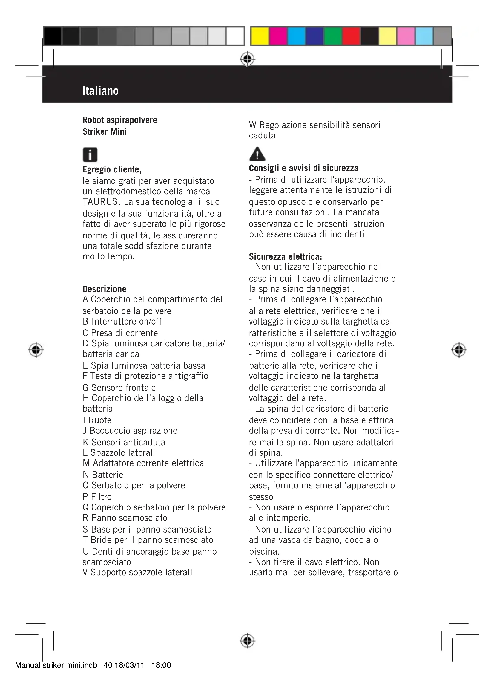 eine neue ersetzen. 8 Das Gerät bewegt sich nach der Inbetriebnahme rückwärts. Das Gerät befindet sich auf einer dunklen Ober- fläche (das Licht wird nur gering vom Boden widergespiegelt). Die beiden Höhen- sensoren sind auf die Position 2 oder 3 einzustellen (Abb.10). - Im Fall einer Störung bitte den Kundendienst unter der auf dem Garantieschein angegebenen Telefon- nummer verständigen. Versuchen Sie nicht, das Gerät auseinanderzubauen oder zu reparieren, da es gefährlich sein kann. - Ist die Netzverbindung beschädigt, ist wie in sonstigen Schadensfällen vorzugehen. Für Produkte der Europäischen Union und / oder falls vom Gesetz in Ihrem Herkunftsland vorgeschrieben: Umweltschutz und Recycelbarkeit des Produktes Manual striker mini.indb 38 18/03/11 18:00- Die zur Herstellung des Verpac- kungsmaterials dieses Geräts verwen- deten Materialien sind im Sammel-, Klassifizierungs- und Recyclingsystem integriert. Wenn Sie die Verpackung entsorgen möchten, können Sie die öffentlichen Müllcontainer für alle Abfallarten verwenden. - Das Produkt gibt keine Substanzen für die Umwelt schädlichen Konzen- trationen ab. Dieses Symbol bedeutet, dass Sie das Produkt, sobald es abgelaufen ist, von einem entsprechenden Fachmann an einem für Elektrische und Elektronis- che Geräteabfälle (EEGA) geeigneten Ort entsorgen sollen. Dieses Symbol bedeutet, dass das Produkt Batterien beinhalten kann, die vor der Entsorgung entnom- men werden sollen. Beachten Sie, dass die Batterien in dafür geeigneten Containern entsorgt werden sollen. Und nicht ins Feuer geworfen werden dürfen. Wie Sie die Batterien aus dem Gerät entfernen: WARNUNG: Es ist wichtig, dass die Batterien vollständig leer sind, bevor Sie sie aus dem Gerät entfernen. Zum Entfernen der Batterien am Ende der Lebensdauer des Gerätes verfahren Sie wie folgt: - Entfernen Sie den Deckel des Batteriefachs. - Die Batterie aus seinem Fach entfernen. - Entfernen Sie den Deckel des Batteriefachs. Dieses Gerät erfüllt die Normen 2006/95/EC für Niederspannung und die Normen 2004/108/EC für elektro- magnetische Verträglichkeit. Manual striker mini.indb 39 18/03/11 18:00Italiano Robot aspirapolvere Striker Mini Egregio cliente, le siamo grati per aver acquistato un elettrodomestico della marca TAURUS. La sua tecnologia, il suo design e la sua funzionalità, oltre al fatto di aver superato le più rigorose norme di qualità, le assicureranno una totale soddisfazione durante molto tempo. Descrizione A Coperchio del compartimento del serbatoio della polvere B Interruttore on/off C Presa di corrente D Spia luminosa caricatore batteria/ batteria carica E Spia luminosa batteria bassa F Testa di protezione antigraffio G Sensore frontale H Coperchio dell’alloggio della batteria I Ruote J Beccuccio aspirazione K Sensori anticaduta L Spazzole laterali M Adattatore corrente elettrica N Batterie O Serbatoio per la polvere P Filtro Q Coperchio serbatoio per la polvere R Panno scamosciato S Base per il panno scamosciato T Bride per il panno scamosciato U Denti di ancoraggio base panno scamosciato V Supporto spazzole laterali W Regolazione sensibilità sensori caduta Consigli e avvisi di sicurezza - Prima di utilizzare l’apparecchio, leggere attentamente le istruzioni di questo opuscolo e conservarlo per future consultazioni. La mancata osservanza delle presenti istruzioni può essere causa di incidenti. Sicurezza elettrica: - Non utilizzare l’apparecchio nel caso in cui il cavo di alimentazione o la spina siano danneggiati. - Prima di collegare l’apparecchio alla rete elettrica, verificare che il voltaggio indicato sulla targhetta ca- ratteristiche e il selettore di voltaggio corrispondano al voltaggio della rete. - Prima di collegare il caricatore di batterie alla rete, verificare che il voltaggio indicato nella targhetta delle caratteristiche corrisponda al voltaggio della rete. - La spina del caricatore di batterie deve coincidere con la base elettrica della presa di corrente. Non modifica- re mai la spina. Non usare adattatori di spina. - Utilizzare l’apparecchio unicamente con lo specifico connettore elettrico/ base, fornito insieme all’apparecchio stesso - Non usare o esporre l’apparecchio alle intemperie. - Non utilizzare l’apparecchio vicino ad una vasca da bagno, doccia o piscina. - Non tirare il cavo elettrico. Non usarlo mai per sollevare, trasportare o Manual striker mini.indb 40 18/03/11 18:00scollegare l’apparecchio. - Non tirare il cavo elettrico. Non usarlo mai per sollevare, trasportare o scollegare il caricatore di batterie. - Non toccare mai la spina con le mani bagnate. Sicurezza personale: - Evitare qualsiasi contatto con il liquido che può fuoriuscire dalla bat- teria. In caso di contatto accidentale con gli occhi, rivolgersi a un medico. Il liquido che fuoriesce dalla batteria può provocare irritazioni o ustioni. Precauzioni d’uso: - Prima di ogni utilizzo, svolgere com- pletamente il cavo dell’apparecchio. - Non usare l’apparecchio se gli accessori o consumibili non sono accoppiati correttamente. - Non utilizzare l’apparecchio se il suo dispositivo d’avvio/arresto non funziona. - Non muovere l’apparecchio durante l’uso - Non forzare la capacità di lavoro dell’apparecchio. - Rimuovere le pile o batterie dall’apparecchio se non lo si utilizza per un lungo periodo. - Staccare il caricatore di batterie dalla presa di corrente quando l’apparecchio non è in uso e prima di compiere qualsiasi operazione di pulizia. - Questo apparecchio è destinato unicamente all’uso domestico, non professionale o industriale. - Questo apparecchio non è un gio- cattolo. Assicurarsi che i bambini non giochino con l’apparecchio. - Questo apparecchio è stato conce- pito per essere utilizzato esclusiva- mente da adulti. Non permettere che venga utilizzato da bambini o da persone che non ne conoscono il funzionamento. - Tenere fuori della portata di bambini e/o persone disabili. - Non aspirare mai oggett