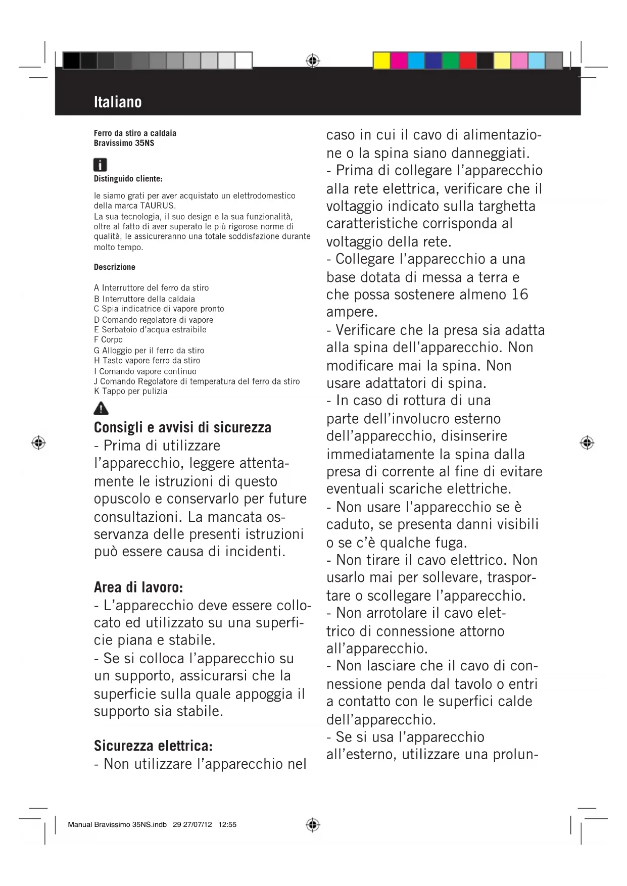 Bravissimo 35 Non Stop - Ferro da stiro TAURUS - Manuale utente e istruzioni gratuiti
