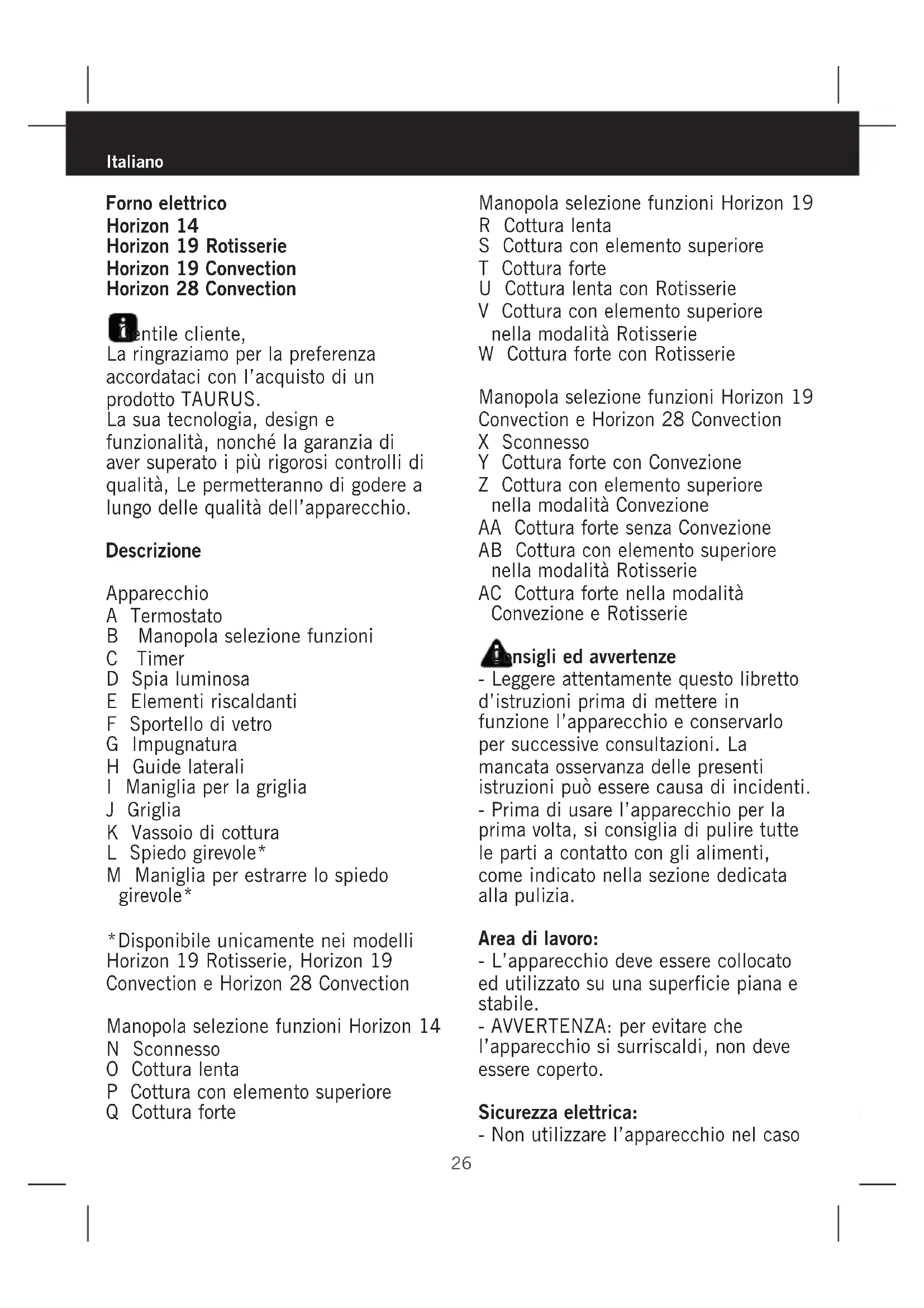 Scarica le istruzioni per il tuo Forno in formato PDF gratuitamente! Trova il tuo manuale Horizon 14 - TAURUS e riprendi in mano il tuo dispositivo elettronico. In questa pagina sono pubblicati tutti i documenti necessari per l'utilizzo del tuo dispositivo. Horizon 14 del marchio TAURUS.