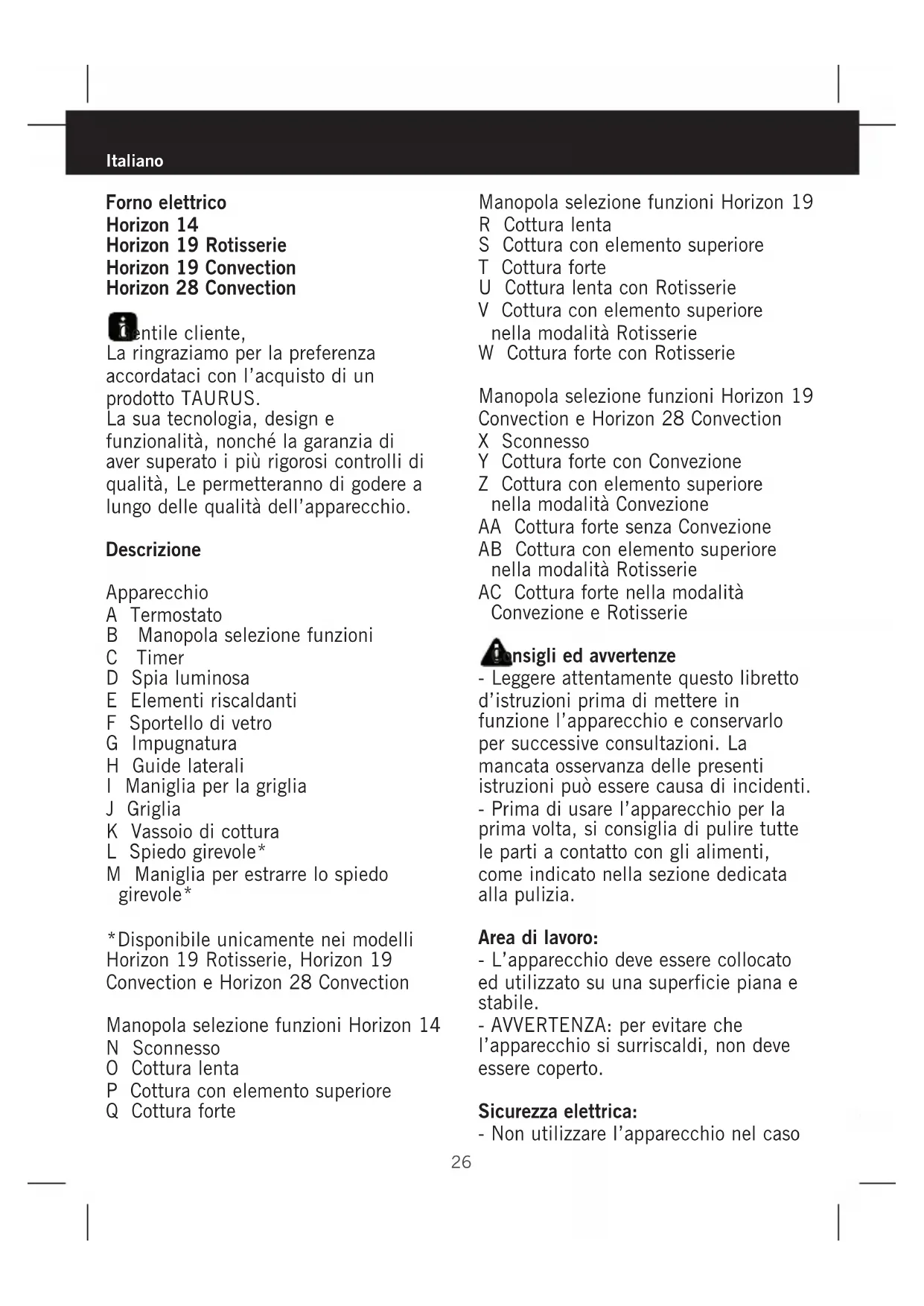 Horizon 19 Rotisserie - Forno TAURUS - Manuale utente e istruzioni gratuiti