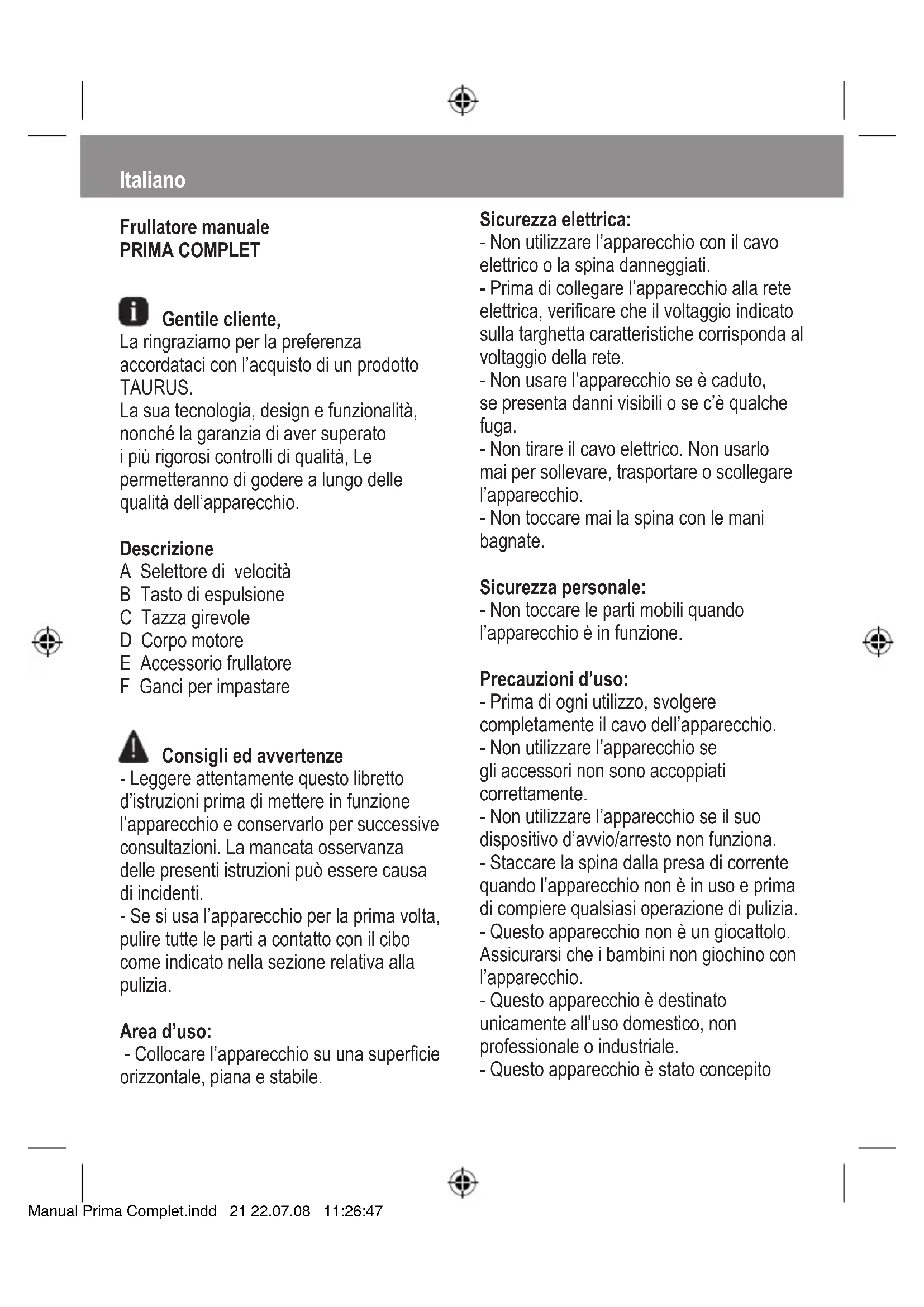 Prima Complet - Mixer TAURUS - Manuale utente e istruzioni gratuiti