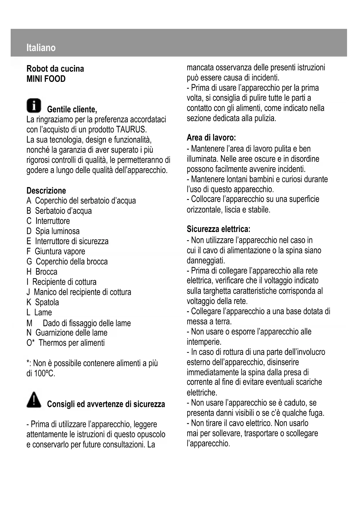 Trova gratuitamente il manuale del dispositivo Mini Food TAURUS in formato PDF.