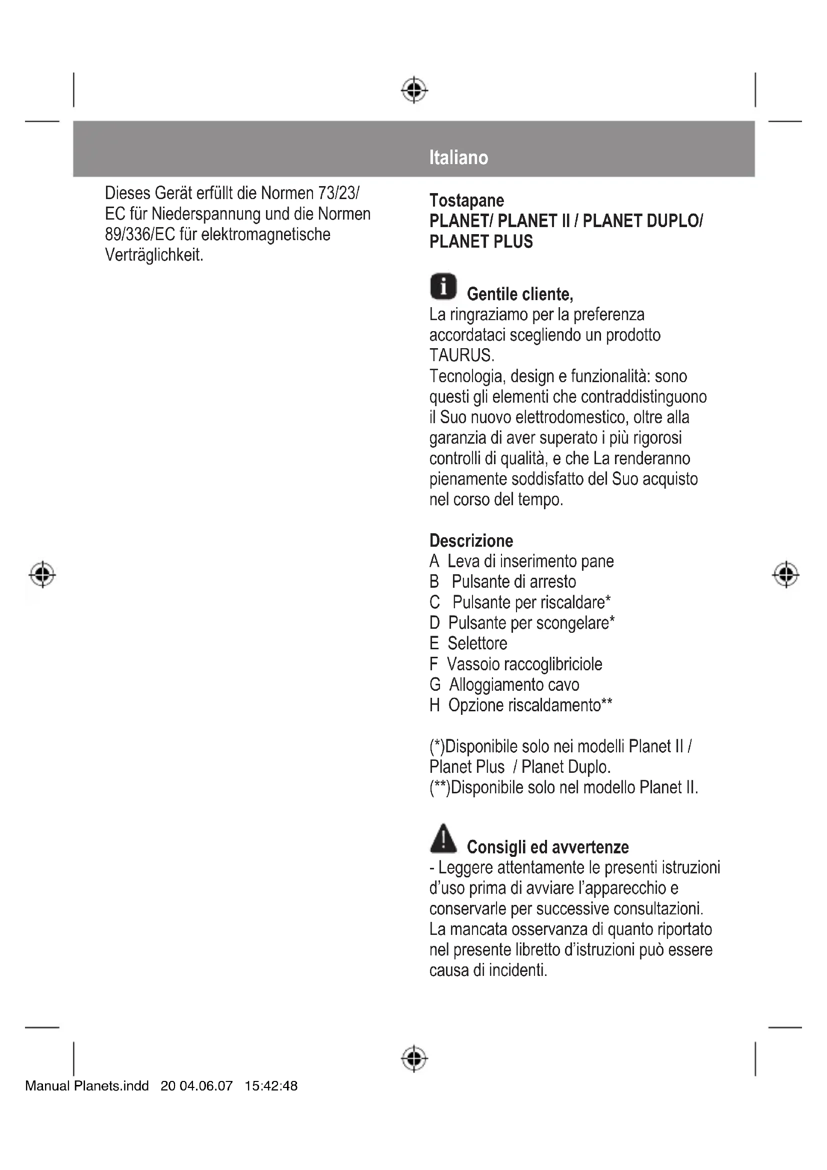 PLANET PLUS Gentile cliente, La ringraziamo per la preferenza accordataci scegliendo un prodotto TAURUS. Tecnologia, design e funzionalità: sono questi gli elementi che contraddistinguono il Suo nuovo elettrodomestico, oltre alla garanzia di aver superato i più rigorosi controlli di qualità, e che La renderanno pienamente soddisfatto del Suo acquisto nel corso del tempo. Descrizione A Leva di inserimento pane B Pulsante di arresto C Pulsante per riscaldare* D Pulsante per scongelare* E Selettore F Vassoio raccoglibriciole G Alloggiamento cavo H Opzione riscaldamento** (*)Disponibile solo nei modelli Planet II / Planet Plus / Planet Duplo. (**)Disponibile solo nel modello Planet II. Consigli ed avvertenze - Leggere attentamente le presenti istruzioni d’uso prima di avviare l’apparecchio e conservarle per successive consultazioni. La mancata osservanza di quanto riportato nel presente libretto d’istruzioni può essere causa di incidenti. Dieses Gerät erfüllt die Normen 73/23/ EC für Niederspannung und die Normen 89/336/EC für elektromagnetische Verträglichkeit. Manual Planets.indd 20 04.06.07 15:42:48Area di lavoro: - AVVERTENZA: per evitare che l’apparecchio si surriscaldi, non coprirlo. - Non usare l’apparecchio vicino a materiali infiammabili, come tende, mobili, ecc. Sicurezza elettrica: - Non utilizzare l’apparecchio se il cavo elettrico o la spina sono danneggiati. - Prima di collegare l’apparecchio alla rete elettrica, accertarsi che la tensione di rete corrisponda a quella indicata sulla targa delle caratteristiche del prodotto. - Collegare l’apparecchio ad una presa elettrica provvista di messa a terra e con una portata minima di 10 ampere. - Verificare che la presa sia del tipo adatto alla spina dell’apparecchio; quest’ultima non deve essere mai modificata. Non usare mai adattatori di corrente. - Non esporre l’apparecchio alle intemperie. - Non usare l’apparecchio in caso di caduta accidentale dello stesso, se presenta segni visibili di danno o in caso di fuoriuscite. - Non tirare il cavo elettrico, non usarlo mai per sollevare o trasportare l’apparecchio, o per disinserire la spina dalla presa di corrente. - Non arrotolare il cavo intorno all’apparecchio. - Non lasciare che il cavo entri a contatto con le superfici calde dell’apparecchio. - Non toccare mai la spina di connessione con le mani bagnate. Sicurezza personale: - Quando l’apparecchio è in funzione, la temperatura delle superfici esterne può essere elevata. Precauzioni d’uso: - Prima dell’uso, svolgere completamente il cavo di alimentazione dell’apparecchio. - Non utilizzare l’apparecchio se il dispositivo d’accensione/spegnimento non funziona. - Non muovere o spostare l’apparecchio durante l’uso. - Non capovolgere l’apparecchio se è in funzione o collegato alla presa. - Disinserire sempre la spina dell’apparecchio dalla presa di corrente in caso di inutilizzo e prima di procedere alla pulizia dello stesso. - Questo apparecchio è destinato esclusivamente all’uso domestico; non è adatto all’uso professionale o industriale. - Questo apparecchio è destinato all’uso esclusivo da parte di adulti; non permettere che venga usato da parte di persone che non ne conoscono il funzionamento, persone disabili o bambini. - Tenere fuori dalla portata dei bambini e delle persone disabili. - Lasciare raffreddare l’apparecchio prima di conservarlo. - Qualsiasi uso improprio o difforme dalle presenti istruzioni d’uso può essere pericoloso, invalida la garanzia ed esime il produttore da ogni tipo responsabilità. Modalità d’uso Prima dell’uso: - Se si utilizza il prodotto per la prima volta, si consiglia di farlo funzionare a vuoto (senza pane). Manual Planets.indd 21 04.06.07 15:42:49Uso: - Collegare l’apparecchio alla rete elettrica. - Inserire le fette di pane nell’apparecchio. - Selezionare il grado di tostatura azionando il selettore. - Mettere in funzione l’apparecchio abbassando la levetta fino al “clic” di blocco. - Le fette di pane si disporranno automaticamente al centro per ottenere una tostatura uniforme (sistema di autocentratura). - Il tostapane si spegnerà automaticamente al termine del tempo di tostatura selezionato. - L’apparecchio dispone della funzione “sollevamento extra” che consente di estrarre più comodamente le fette di pane tostato. A tal fine, spingere la levetta verso l’alto. Funzione interruzione tostatura: - Premere il tasto d’interruzione (B) per interrompere la tostatura. Funzione riscaldamento: - Questa funzione permette di riscaldare il pane già tostato. A tal fine, premere il pulsante per riscaldare (C), inserire la fetta di pane e spingere la leva verso il basso. Funzione scongelamento: - Questa funzione permette di scongelare le fette di pane. A tal fine, premere il pulsante per scongelare (D), inserire la fetta di pane congelata e spingere la leva verso il basso. Dopo l’uso: - Scollegare l’apparecchio dalla rete elettrica. - Riavvolgere il cavo e sistemarlo nel vano apposito. Pulizia - Disinserire la spina dell’apparecchio dalla rete elettrica ed aspettare che si raffreddi prima di eseguirne la pulizia. - Pulire l’apparecchio con un panno umido impregnato di qualche goccia di detersivo e quindi asciugarlo. - Per eseguire la pulizia dell’apparecchio, si raccomanda di non usare prodotti abrasivi, solventi o prodotti con pH acido o basico, come la candeggina. - Non immergere l’apparecchio in acqua o in altri liquidi e non lavarlo sotto il rubinetto. - Si raccomanda di pulire l’apparecchio periodicamente e di rimuovere tutti i residui di cibo. Vassoio raccoglibriciole: - L’apparecchio dispone di un vassoio che permette di raccogliere le briciole di pane rimaste all’interno dell’apparecchio. - Estrarre il vassoio dall’apparecchio. - Pulirlo. - Scuotere leggermente l’apparecchio per rimuovere eventuali briciole di pane rimaste al suo interno. - Rimettere il vassoio al suo posto. Anoma