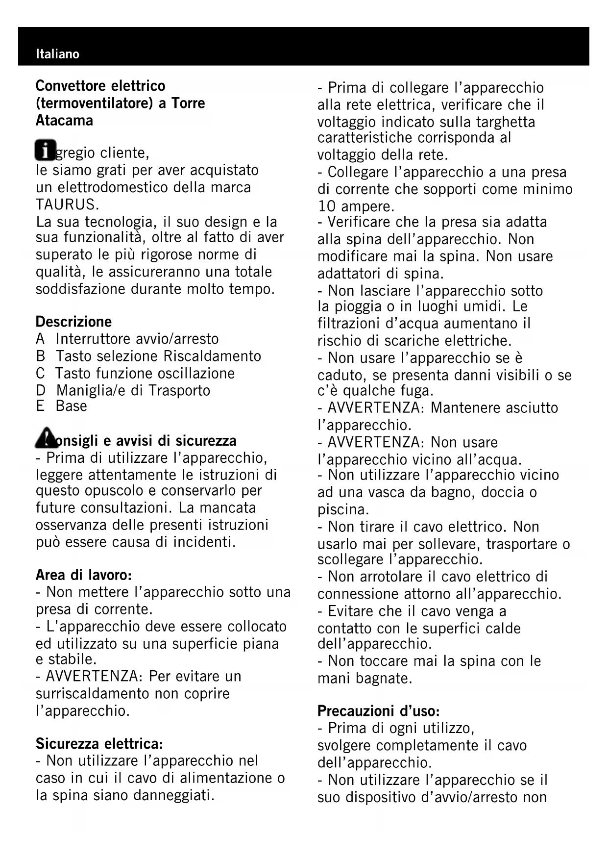 EINTAUCHTEN. - Reinigen Sie das Gerät mit einem feuchten Tuch, auf das Sie einige Tropfen Reinigungsmittel geben und trocknen Sie es danach ab. - Verwenden Sie zur Reinigung des Apparates weder Lösungsmittel noch Scheuermittel oder Produkte mit einem sauren oder basischen pH-Wert wie Lauge. - Das Gerät nicht in Wasser oder andere Flüssigkeiten tauchen und nicht unter den Wasserhahn halten. Störungen und Reparatur - Bringen Sie das Gerät im Falle einer Störung zu einem zugelassenen technischen Wartungsdienst. Versuchen Sie nicht, das Gerät zu reparieren oder zu demontieren, da dies gefährlich sein könnte. - Ist die Netzverbindung beschädigt, ist wie in sonstigen Schadensfällen vorzugehen. Für Produkte der Europäischen Union und / oder falls vom Gesetz in Ihrem Herkunftsland vorgeschrieben: Umweltschutz und Recycelbarkeit des Produktes - Die zur Herstellung des Verpackungsmaterials dieses Geräts verwendeten Materialien sind im Sammel-, Klassifizierungs- und Recyclingsystem integriert. Wenn Sie die Verpackung entsorgen möchten, können Sie die öffentlichen Müllcontainer für alle Abfallarten verwenden. - Das Produkt gibt keine Substanzen für die Umwelt schädlichen Konzentrationen ab. Dieses Gerät erfüllt die Normen 2006/95/EC für Niederspannung und die Normen 2004/108/EC für elektromagnetische Verträglichkeit. - Dieses Symbol bedeutet, dass Sie das Produkt, sobald es abgelaufen ist, von einem entsprechenden Fachmann an einem für Elektrische und Elektronische Geräteabfälle (EEGA) geeigneten Ort entsorgen sollen.Italiano Convettore elettrico (termoventilatore) a Torre Atacama Egregio cliente, le siamo grati per aver acquistato un elettrodomestico della marca TAURUS. La sua tecnologia, il suo design e la sua funzionalità, oltre al fatto di aver superato le più rigorose norme di qualità, le assicureranno una totale soddisfazione durante molto tempo. Descrizione A Interruttore avvio/arresto B Tasto selezione Riscaldamento C Tasto funzione oscillazione D Maniglia/e di Trasporto E Base Consigli e avvisi di sicurezza - Prima di utilizzare l’apparecchio, leggere attentamente le istruzioni di questo opuscolo e conservarlo per future consultazioni. La mancata osservanza delle presenti istruzioni può essere causa di incidenti. Area di lavoro: - Non mettere l’apparecchio sotto una presa di corrente. - L’apparecchio deve essere collocato ed utilizzato su una superficie piana e stabile. - AVVERTENZA: Per evitare un surriscaldamento non coprire l’apparecchio. Sicurezza elettrica: - Non utilizzare l’apparecchio nel caso in cui il cavo di alimentazione o la spina siano danneggiati. - Prima di collegare l’apparecchio alla rete elettrica, verificare che il voltaggio indicato sulla targhetta caratteristiche corrisponda al voltaggio della rete. - Collegare l’apparecchio a una presa di corrente che sopporti come minimo 10 ampere. - Verificare che la presa sia adatta alla spina dell’apparecchio. Non modificare mai la spina. Non usare adattatori di spina. - Non lasciare l’apparecchio sotto la pioggia o in luoghi umidi. Le filtrazioni d’acqua aumentano il rischio di scariche elettriche. - Non usare l’apparecchio se è caduto, se presenta danni visibili o se c’è qualche fuga. - AVVERTENZA: Mantenere asciutto l’apparecchio. - AVVERTENZA: Non usare l’apparecchio vicino all’acqua. - Non utilizzare l’apparecchio vicino ad una vasca da bagno, doccia o piscina. - Non tirare il cavo elettrico. Non usarlo mai per sollevare, trasportare o scollegare l’apparecchio. - Non arrotolare il cavo elettrico di connessione attorno all’apparecchio. - Evitare che il cavo venga a contatto con le superfici calde dell’apparecchio. - Non toccare mai la spina con le mani bagnate. Precauzioni d’uso: - Prima di ogni utilizzo, svolgere completamente il cavo dell’apparecchio. - Non utilizzare l’apparecchio se il suo dispositivo d’avvio/arresto nonnon conforme alle istruzioni d’uso. Installazione - La spina deve essere facilmente accessibile per poterla staccare in caso di emergenza. - L’apparecchio deve essere utilizzato con i piedini base inseriti. Montaggio della base: - Per montare la base, capovolgere l’apparecchio. - Collocare la base del corpo dell’apparecchio. - Fissare la base mediante le viti ad alette fornite. Collocare l’apparecchio in posizione corretta e controllare il buon funzionamento della base. Modalità d’uso Uso: - Srotolare completamente il cavo prima di attaccare la spina. - Collegare l’apparecchio alla rete elettrica. - Avviare l’apparecchio azionando l’interruttore avvio/arresto. - Selezionare la potenza desiderata. Funzione oscillazione: - La funzione oscillazione permette di dirigere il flusso d’aria che esce dall’apparecchio affinché copra alternativamente e automaticamente un raggio massimo di 75º. - Per attivare questa funzione, premere il tasto (C). - Per disattivarla, effettuare l’operazione inversa. funziona. - Non rimuovere i piedini base dell’apparecchio. - Non muovere l’apparecchio durante l’uso - Quando l’apparecchio è usato in bagno o in altri ambienti umidi, scollegarlo dall’alimentazione in caso di inutilizzo, anche se per poco tempo: la vicinanza dell’acqua può rappresentare un pericolo anche quando l’apparecchio è spento. - Staccare la spina dalla presa di corrente quando l’apparecchio non è in uso e prima di compiere qualsiasi operazione di pulizia. - Questo apparecchio è destinato unicamente all’uso domestico, non professionale o industriale. - Questo apparecchio non è un giocattolo. Assicurarsi che i bambini non giochino con l’apparecchio. - Questo apparecchio è stato concepito per essere utilizzato esclusivamente da adulti. Non permettere che venga utilizzato da bambini o da persone che non ne conoscono il funzionamento. - Tenere fuori della portata di bambini e/o persone disabili. - Questo apparecchio non è dotato di un dispositivo di controllo della temperatura ambiente
