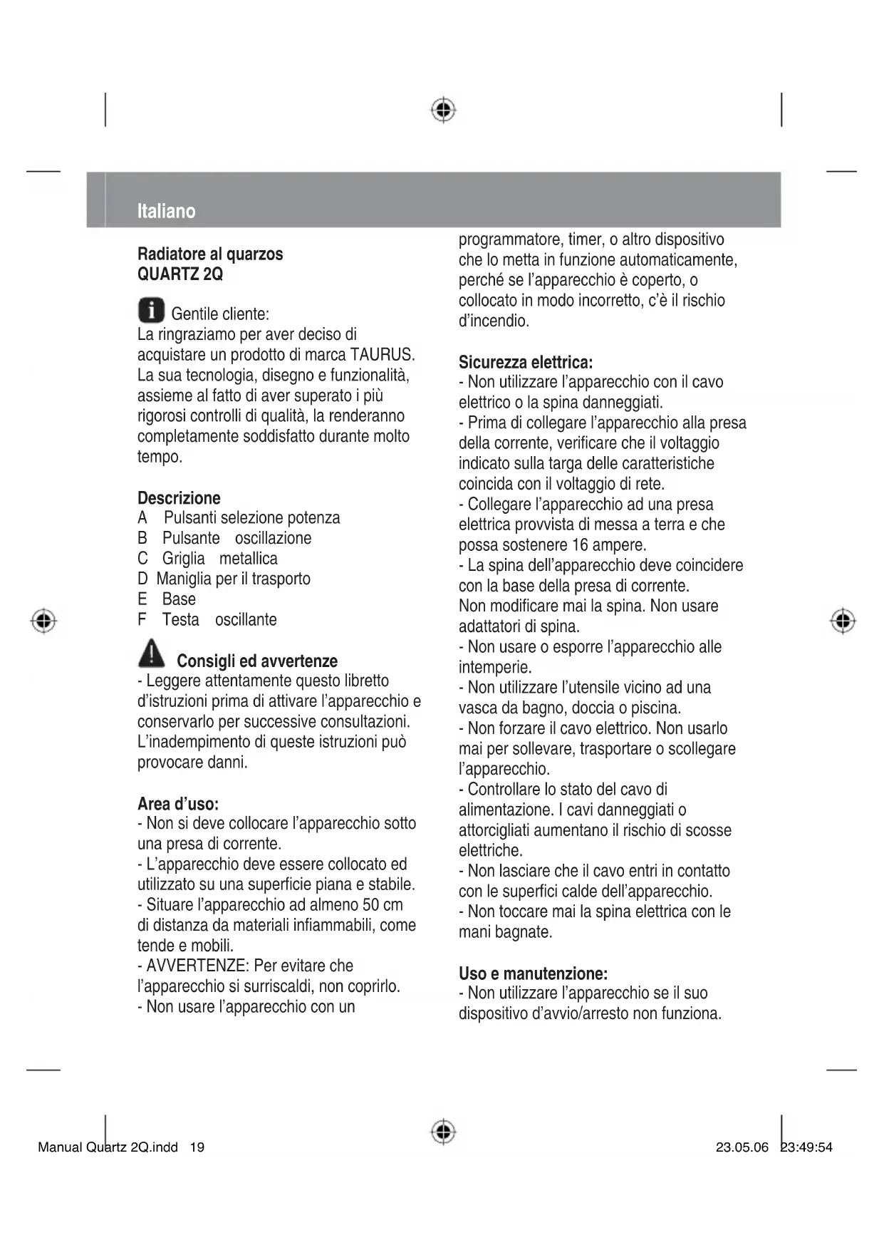 Scarica le istruzioni per il tuo Riscaldamento in formato PDF gratuitamente! Trova il tuo manuale Quartz 2Q - TAURUS e riprendi in mano il tuo dispositivo elettronico. In questa pagina sono pubblicati tutti i documenti necessari per l'utilizzo del tuo dispositivo. Quartz 2Q del marchio TAURUS.