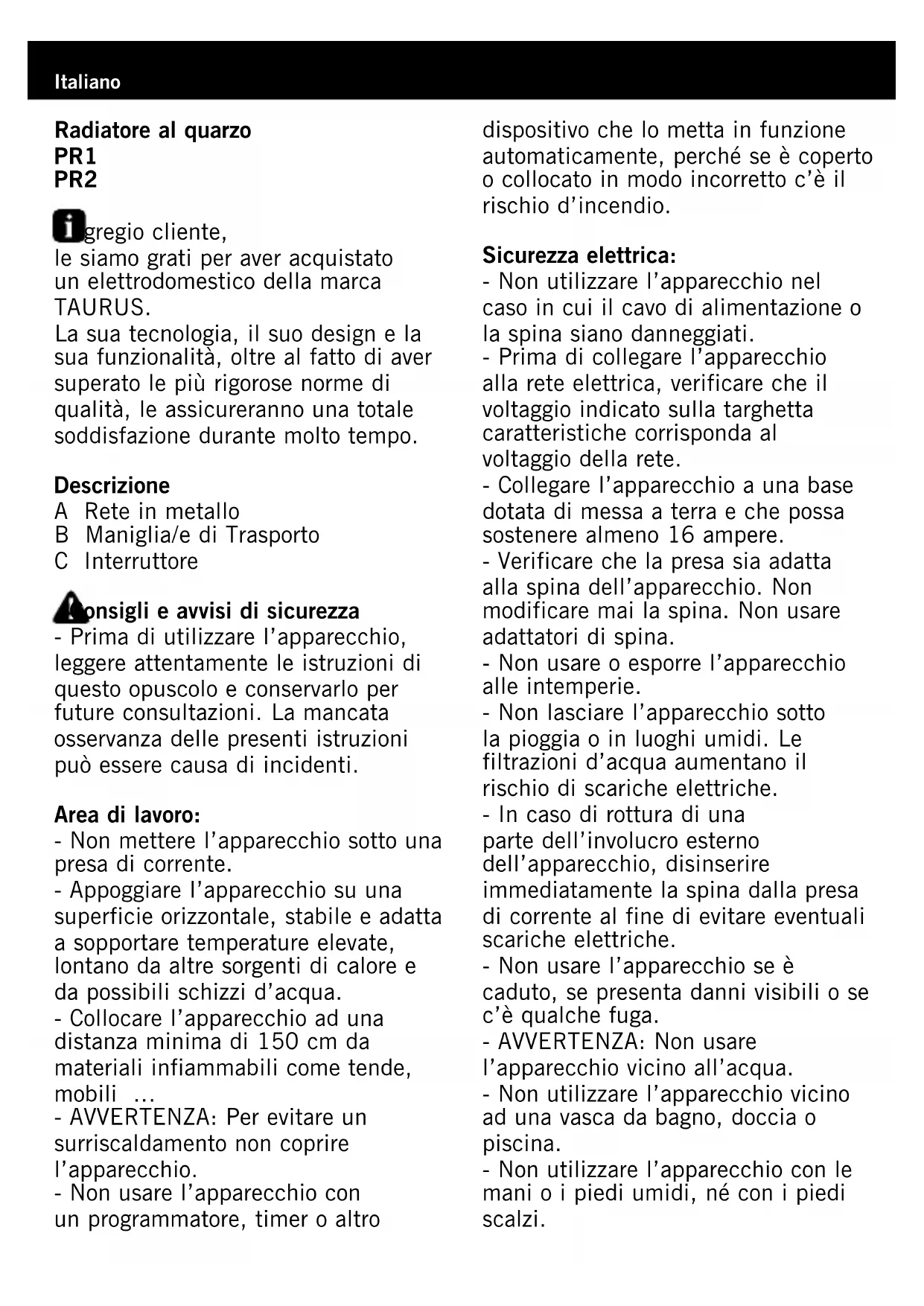 PR1 - Riscaldamento TAURUS - Manuale utente e istruzioni gratuiti