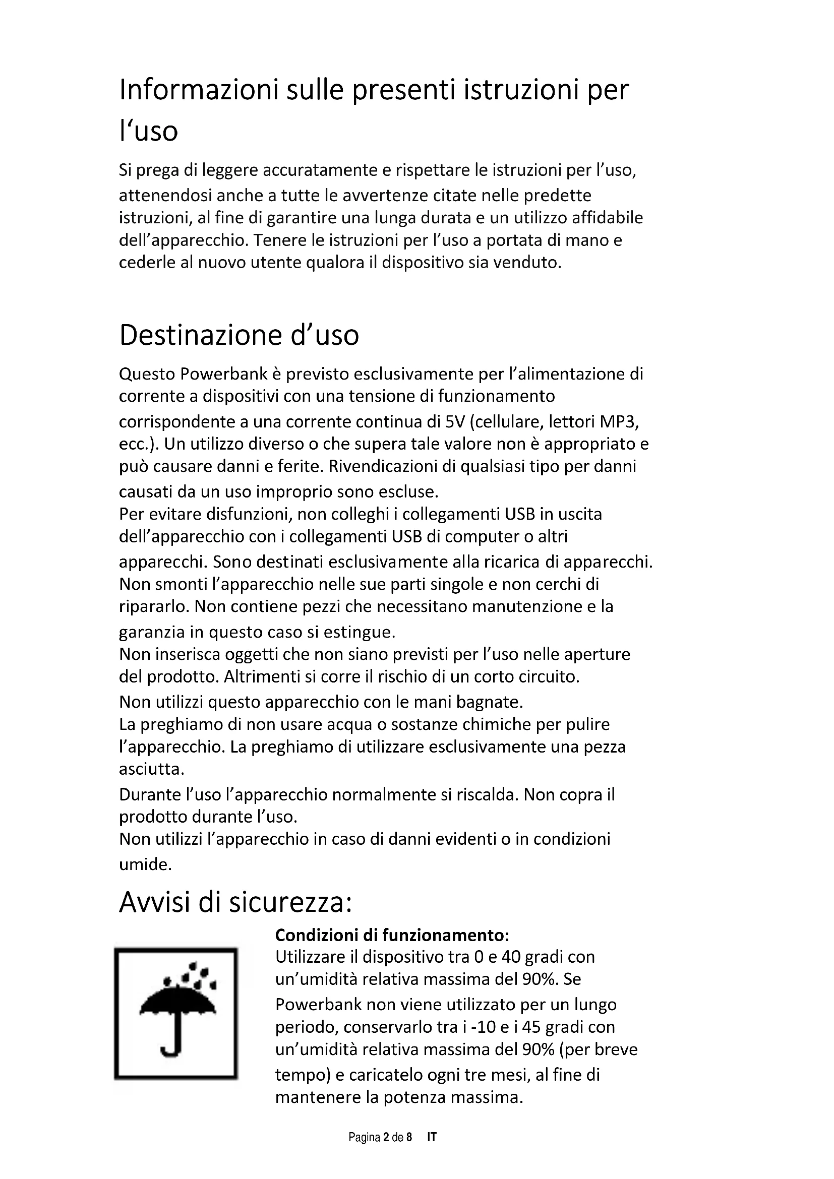 Pagina 1 de 8 ITInformazioni sulle presenti istruzioni per l‘uso Si prega di leggere accuratamente e rispettare le istruzioni per l’uso, attenendosi anche a tutte le avvertenze citate nelle predette istruzioni, al fine di garantire una lunga durata e un utilizzo affidabile dell’apparecchio. Tenere le istruzioni per l’uso a portata di mano e cederle al nuovo utente qualora il dispositivo sia venduto. Destinazione d’uso Questo Powerbank è previsto esclusivamente per l’alimentazione di corrente a dispositivi con una tensione di funzionamento corrispondente a una corrente continua di 5V (cellulare, lettori MP3, ecc.). Un utilizzo diverso o che supera tale valore non è appropriato e può causare danni e ferite. Rivendicazioni di qualsiasi tipo per danni causati da un uso improprio sono escluse. Per evitare disfunzioni, non colleghi i collegamenti USB in uscita dell’apparecchio con i collegamenti USB di computer o altri apparecchi. Sono destinati esclusivamente alla ricarica di apparecchi. Non smonti l’apparecchio nelle sue parti singole e non cerchi di ripararlo. Non contiene pezzi che necessitano manutenzione e la garanzia in questo caso si estingue. Non inserisca oggetti che non siano previsti per l’uso nelle aperture del prodotto. Altrimenti si corre il rischio di un corto circuito. Non utilizzi questo apparecchio con le mani bagnate. La preghiamo di non usare acqua o sostanze chimiche per pulire l’apparecchio. La preghiamo di utilizzare esclusivamente una pezza asciutta. Durante l’uso l’apparecchio normalmente si riscalda. Non copra il prodotto durante l’uso. Non utilizzi l’apparecchio in caso di danni evidenti o in condizioni umide. Avvisi di sicurezza: Condizioni di funzionamento: Utilizzare il dispositivo tra 0 e 40 gradi con un’umidità relativa massima del 90%. Se Powerbank non viene utilizzato per un lungo periodo, conservarlo tra i -10 e i 45 gradi con un’umidità relativa massima del 90% (per breve tempo) e caricatelo ogni tre mesi, al fine di mantenere la potenza massima. Pagina 2 de 8 ITNon utilizzare l’apparecchio in zone estremamente fredde, calde, umide o polverose. Non esporlo alla luce solare diretta. Evitare il contatto con la fiamma libera. Pericolo di esplosione!