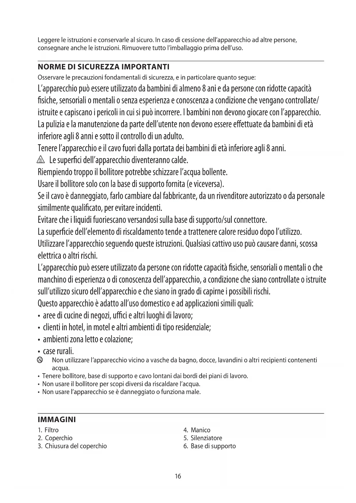 Osservare le precauzioni fondamentali di sicurezza, e in particolare quanto segue: L’apparecchio può essere utilizzato da bambini di almeno 8 ani e da persone con ridotte capacità fisiche, sensoriali o mentali o senza esperienza e conoscenza a condizione che vengano controllate/ istruite e capiscano i pericoli in cui si può incorrere. I bambini non devono giocare con l’apparecchio. La pulizia e la manutenzione da parte dell’utente non devono essere effettuate da bambini di età inferiore agli 8 anni e sotto il controllo di un adulto. Tenere l’apparecchio e il cavo fuori dalla portata dei bambini di età inferiore agli 8 anni. h Le superfici dell’apparecchio diventeranno calde. Riempiendo troppo il bollitore potrebbe schizzare l’acqua bollente. Usare il bollitore solo con la base di supporto fornita (e viceversa). Se il cavo è danneggiato, farlo cambiare dal fabbricante, da un rivenditore autorizzato o da personale similmente qualificato, per evitare incidenti. Evitare che i liquidi fuoriescano versandosi sulla base di supporto/sul connettore. La superficie dell’elemento di riscaldamento tende a trattenere calore residuo dopo l’utilizzo. Utilizzare l’apparecchio seguendo queste istruzioni. Qualsiasi cattivo uso può causare danni, scossa elettrica o altri rischi. L’apparecchio può essere utilizzato da persone con ridotte capacità fisiche, sensoriali o mentali o che manchino di esperienza o di conoscenza dell’apparecchio, a condizione che siano controllate o istruite sull’utilizzo sicuro dell’apparecchio e che siano in grado di capirne i possibili rischi. Questo apparecchio è adatto all’uso domestico e ad applicazioni simili quali: