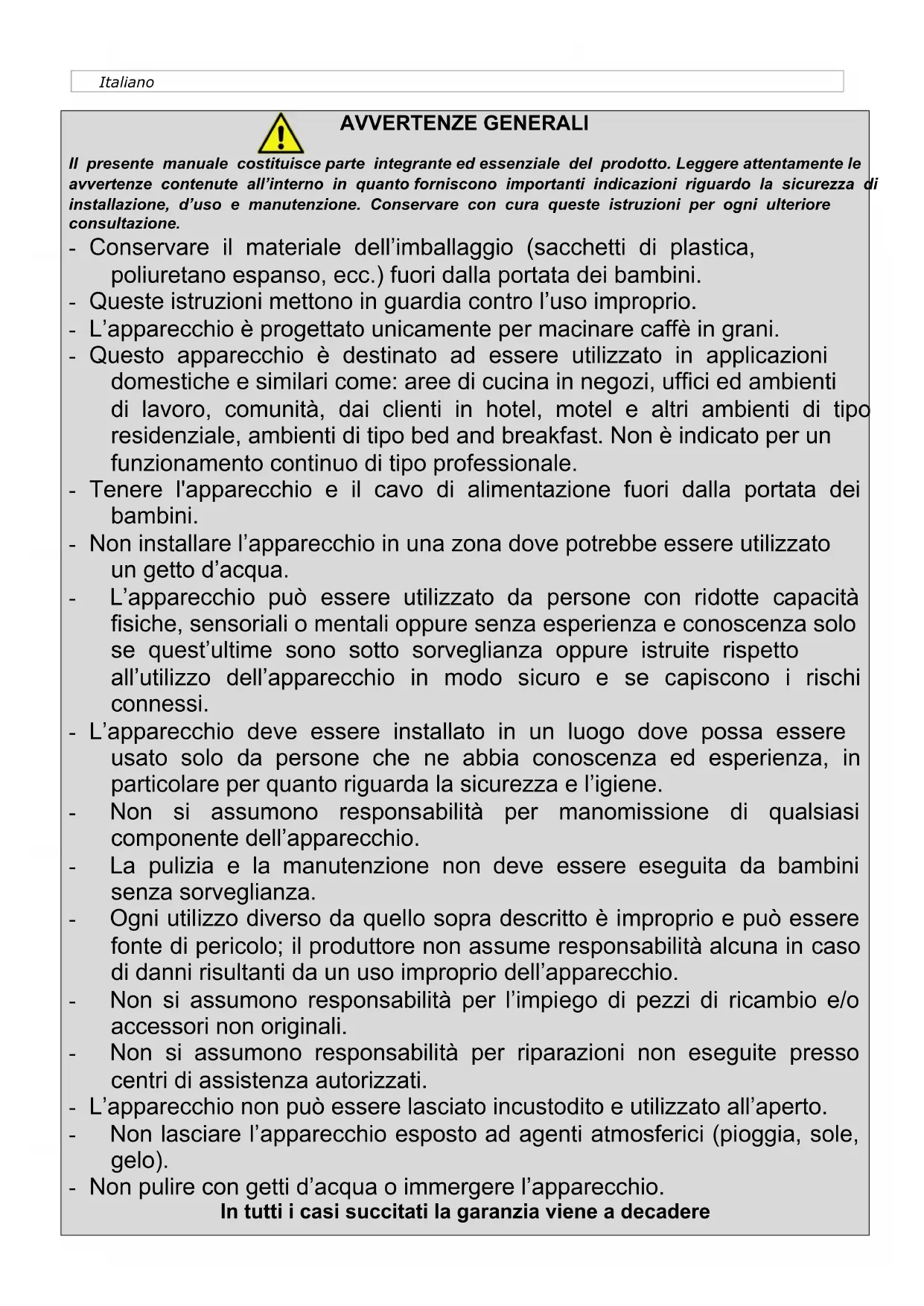 DI MACINATURAItaliano Manutenzione ordinaria e precauzioni: Il grado di macinatura è importante per ottenere un caffè cremoso e cambia a seconda del tipo di caffè. Si consiglia di sostituire periodicamente, quando si riscontra il loro logoramento, le macine coniche. Per la sostituzione o la manutenzione di quanto sopra ci si deve rivolgere ad un centro assistenza autorizzato.