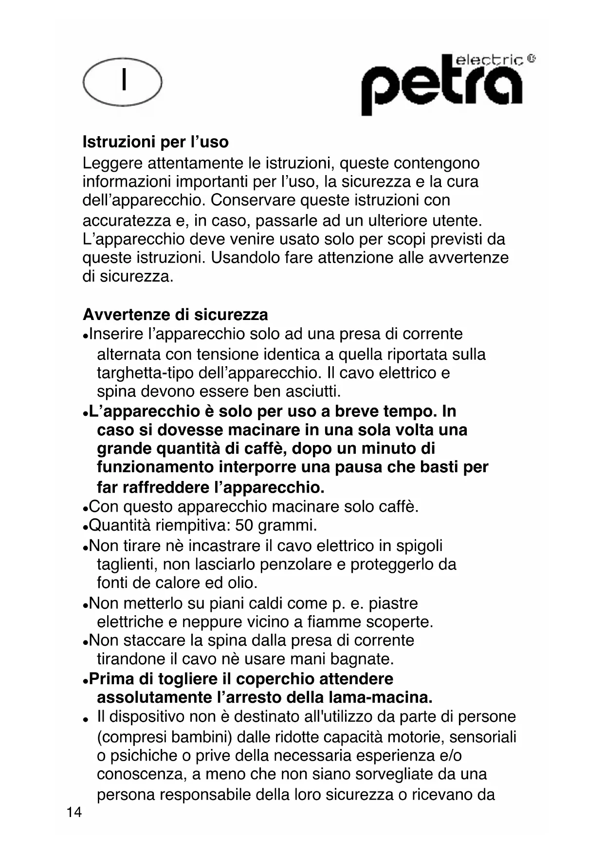 13Istruzioni per l’uso Leggere attentamente le istruzioni, queste contengono informazioni importanti per l’uso, la sicurezza e la cura dell’apparecchio. Conservare queste istruzioni con accuratezza e, in caso, passarle ad un ulteriore utente. L’apparecchio deve venire usato solo per scopi previsti da queste istruzioni. Usandolo fare attenzione alle avvertenze di sicurezza. Avvertenze di sicurezza Inserire l’apparecchio solo ad una presa di corrente alternata con tensione identica a quella riportata sulla targhetta-tipo dell’apparecchio. Il cavo elettrico e spina devono essere ben asciutti. L’apparecchio è solo per uso a breve tempo. In caso si dovesse macinare in una sola volta una grande quantità di caffè, dopo un minuto di funzionamento interporre una pausa che basti per far raffreddere l’apparecchio. Con questo apparecchio macinare solo caffè. Quantità riempitiva: 50 grammi. Non tirare nè incastrare il cavo elettrico in spigoli taglienti, non lasciarlo penzolare e proteggerlo da fonti de calore ed olio. Non metterlo su piani caldi come p. e. piastre elettriche e neppure vicino a fiamme scoperte. Non staccare la spina dalla presa di corrente tirandone il cavo nè usare mani bagnate. Prima di togliere il coperchio attendere assolutamente l’arresto della lama-macina.
