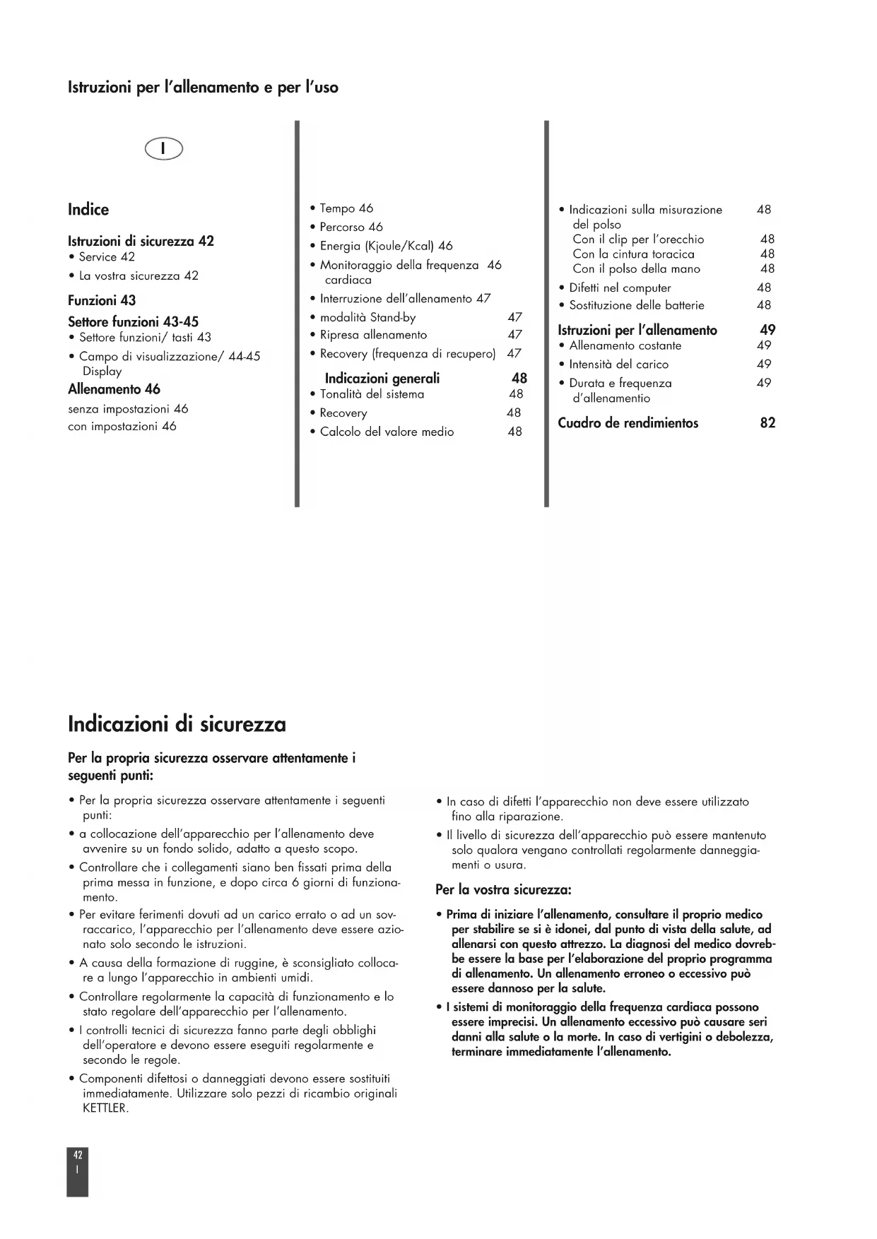 - I sistemi di monitoraggio della frequenza cardiaca possono essere imprecisi. Un allenamento eccessivo può causare seri danni alla salute o la morte. In caso di vertigini o debolezza, terminare immediatamente l’allenamento. Indice Istruzioni di sicurezza 42