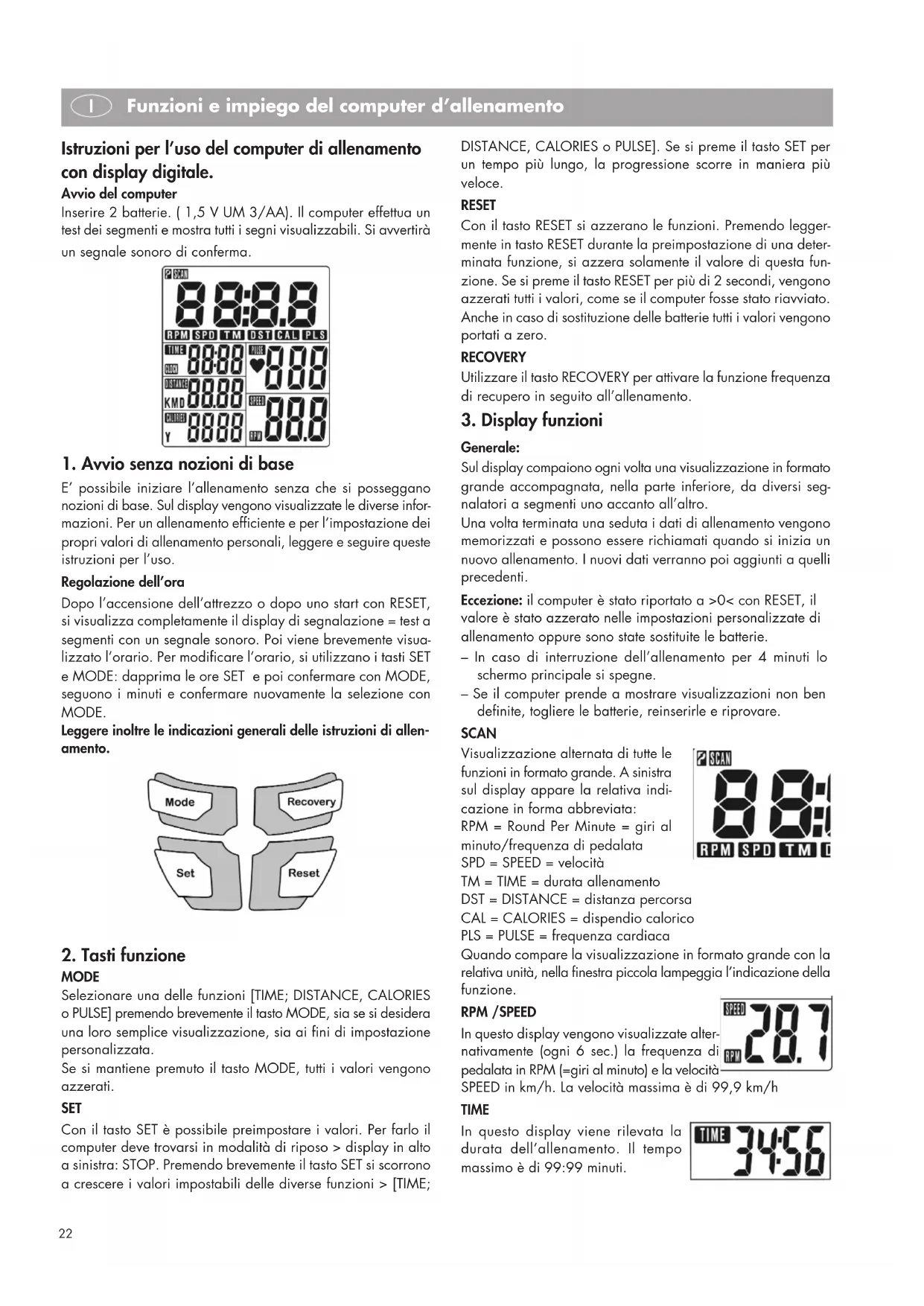 Generale: Sul display compaiono ogni volta una visualizzazione in formato grande accompagnata, nella parte inferiore, da diversi seg- nalatori a segmenti uno accanto all’altro. Una volta terminata una seduta i dati di allenamento vengono memorizzati e possono essere richiamati quando si inizia un nuovo allenamento. I nuovi dati verranno poi aggiunti a quelli precedenti. Eccezione: il computer è stato riportato a >0< con RESET, il valore è stato azzerato nelle impostazioni personalizzate di allenamento oppure sono state sostituite le batterie. – In caso di interruzione dell’allenamento per 4 minuti lo schermo principale si spegne. – Se il computer prende a mostrare visualizzazioni non ben definite, togliere le batterie, reinserirle e riprovare. SCAN Visualizzazione alternata di tutte le funzioni in formato grande. A sinistra sul display appare la relativa indi- cazione in forma abbreviata: RPM = Round Per Minute = giri al minuto/frequenza di pedalata SPD = SPEED = velocità TM = TIME = durata allenamento DST = DISTANCE = distanza percorsa CAL = CALORIES = dispendio calorico PLS = PULSE = frequenza cardiaca Quando compare la visualizzazione in formato grande con la relativa unità, nella finestra piccola lampeggia l’indicazione della funzione. RPM /SPEED In questo display vengono visualizzate alter- nativamente (ogni 6 sec.) la frequenza di pedalata in RPM (=giri al minuto) e la velocità SPEED in km/h. La velocità massima è di 99,9 km/h TIME In questo display viene rilevata la durata dell’allenamento. Il tempo massimo è di 99:99 minuti.23 Funzioni e impiego del computer d’allenamento